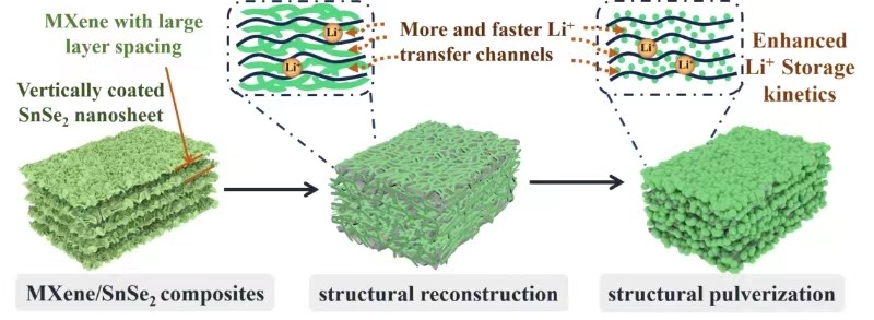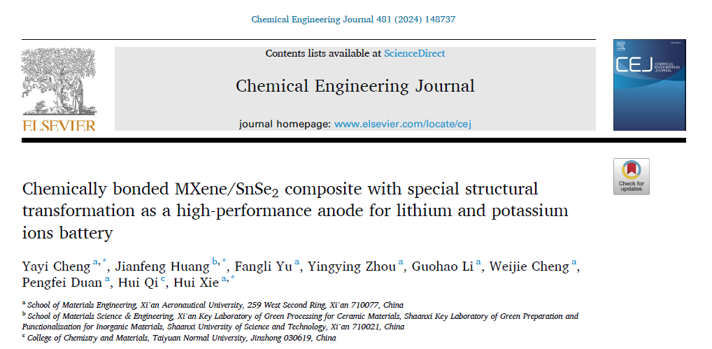 近日,beat365材料工程学院教师程娅伊等人在国际知名期刊《Chemical Engineering Journal》(IF=15.1,JCR Q1,中科院1区)发表题为“Chemically bonded MXene/SnSe2composite with special structural transformation as a high-performance anode for lithium and potassium ions battery”的研究论文。beat365为第一完成单位,陕西科技大学和太原师范学院为共同合作单位,程娅伊为本文第一作者和通讯作者,beat365教授谢辉和陕西科技大学教授黄剑锋为本文共同通讯作者。