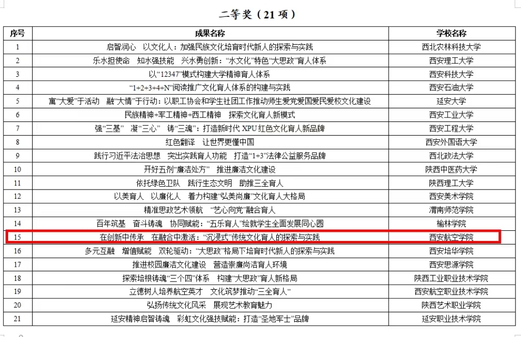 下一步学校将深入学习贯彻习近平文化思想和学校第三次党代会精神,深化“文化西航”建设,打造西航特质文化育人品牌,继续推进中华优秀传统文化“四进”活动,持续推动校园文化建设提质增效,努力培养担当民族复兴大任的时代新人。(文/李亚胜 审核/蔡应昌)