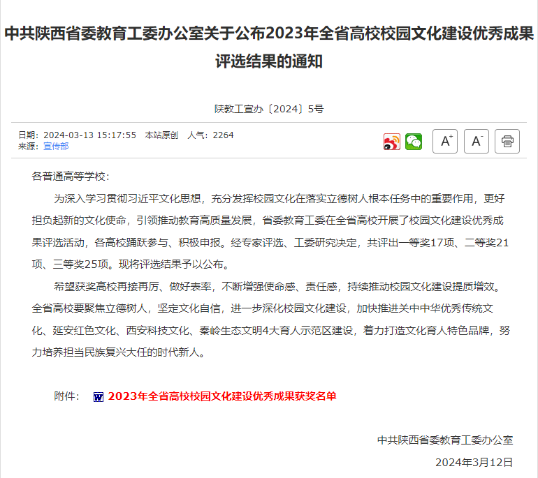 近日,省委教育工委公布了2023年全省高校校园文化建设优秀成果评选结果,党委宣传部、人文与外国语学院申报的《在创新中传承 在融合中激活:“沉浸式”传统文化育人的探索与实践》荣获优秀成果二等奖。