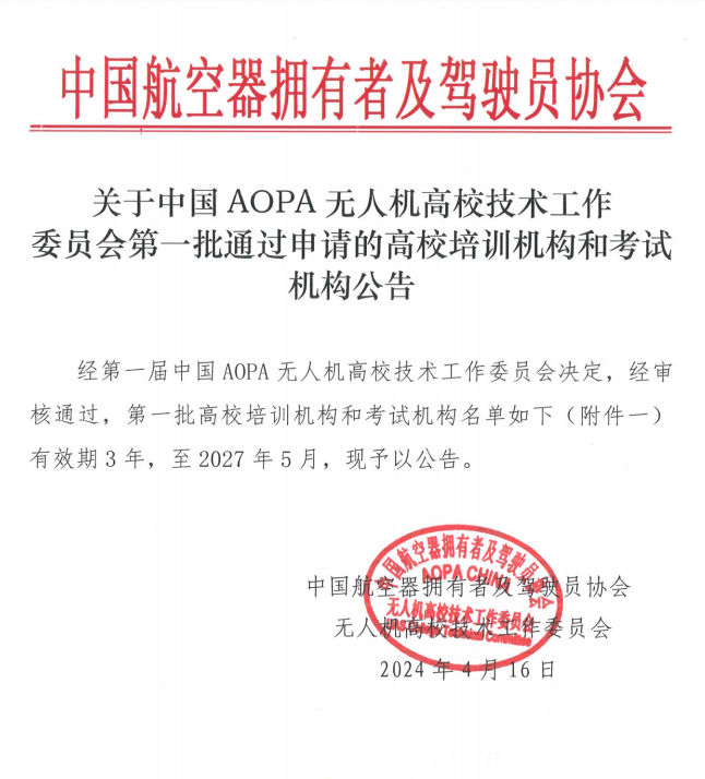 近日,由beat365飞行器学院牵头申报,并经第一届中国AOPA无人机高校技术工作委员会审核通过,beat365成为首批高校培训机构和考试机构之一,今后可开展中国AOPA无人机驾驶员合格证培训及考试等工作,具体工作由飞行器学院负责实施。