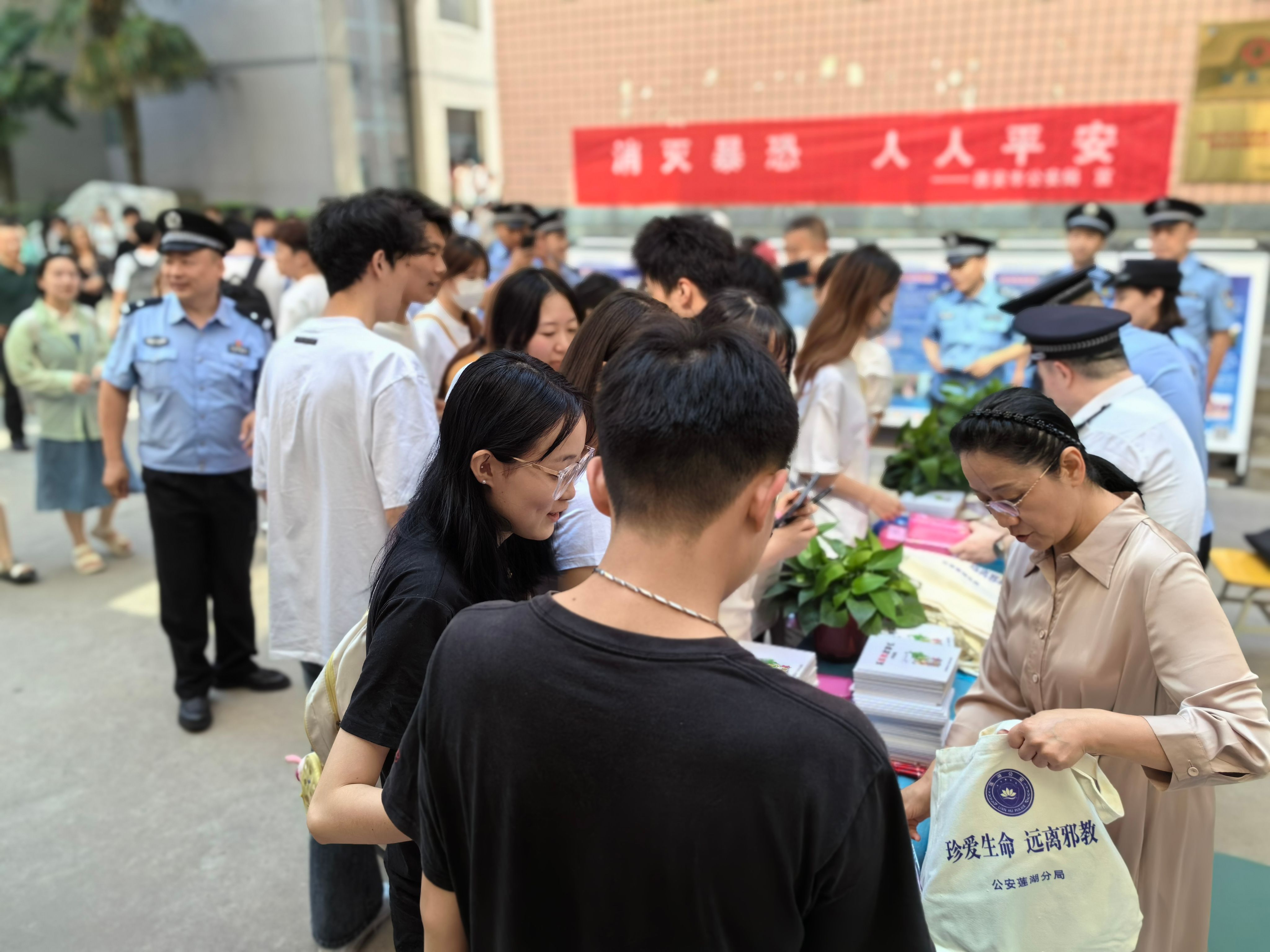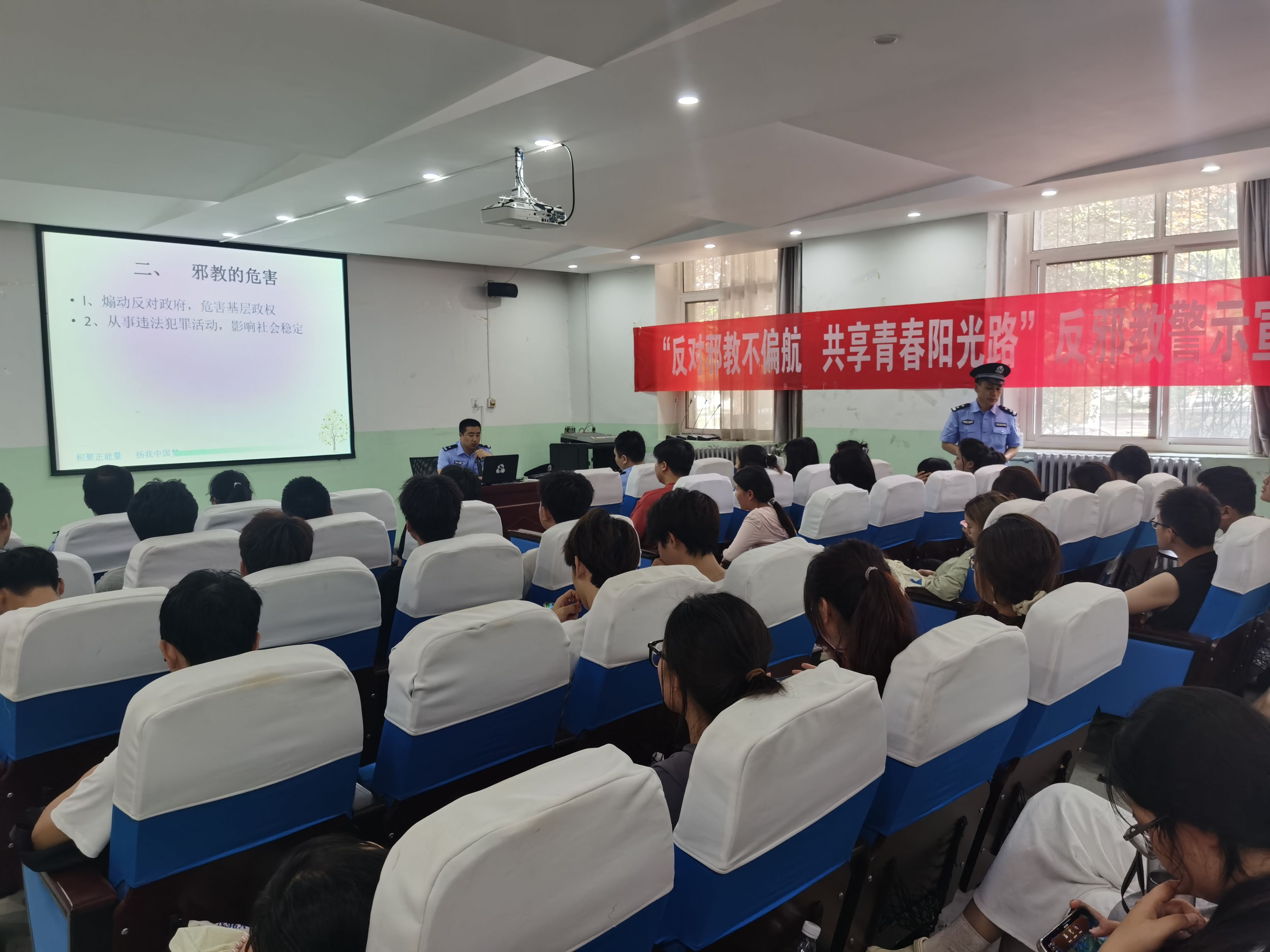 活动现场通过展示反恐、反邪教宣传海报、展板,发放反恐、反邪教知识手册、宣传单,组织观看《警惕邪教对大学校园的侵袭》视频教育片、开展“对邪教说不”网上签名活动和警官现场开展宣讲课堂等形式,向学生讲解反恐、反邪教的重要性,恐怖活动和邪教组织的主要类型及社会危害性,介绍了安全自救互救知识和如何防范邪教侵害等知识,引导学生提高安全意识,崇尚科学,反对邪教。