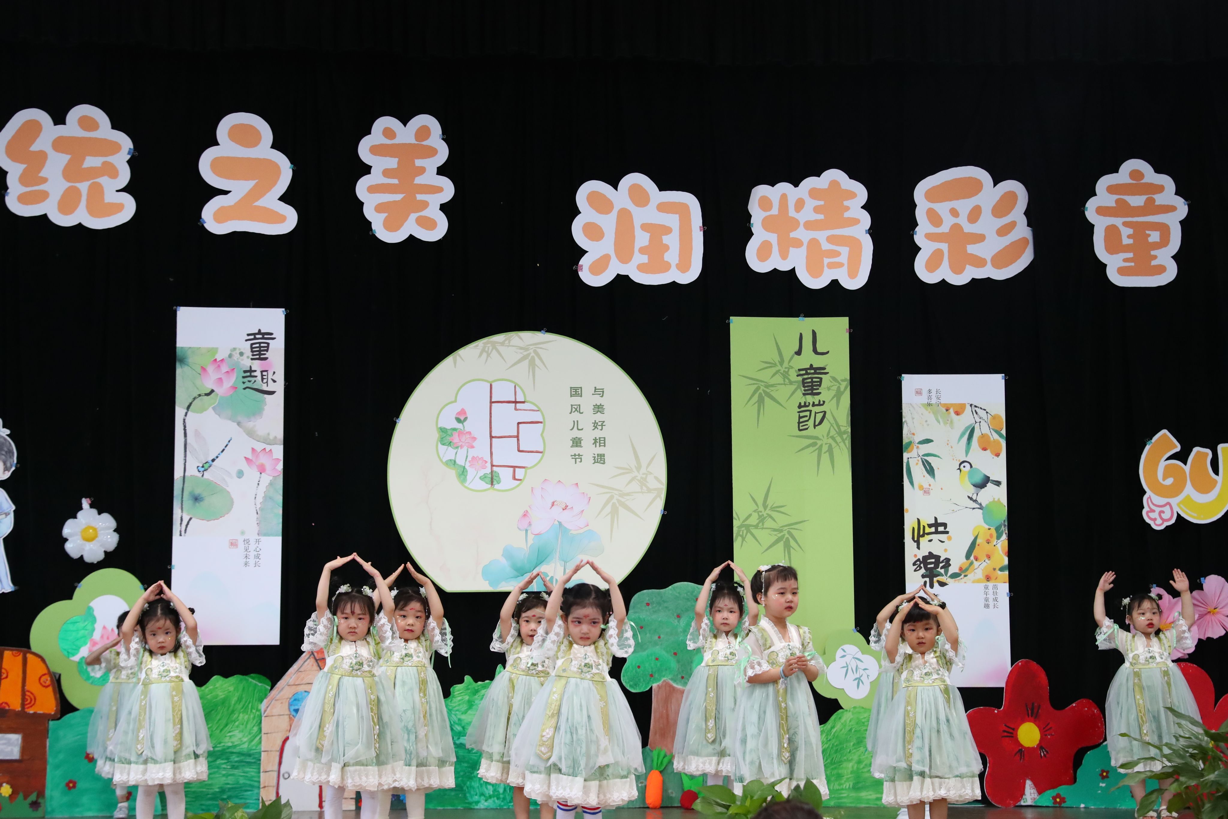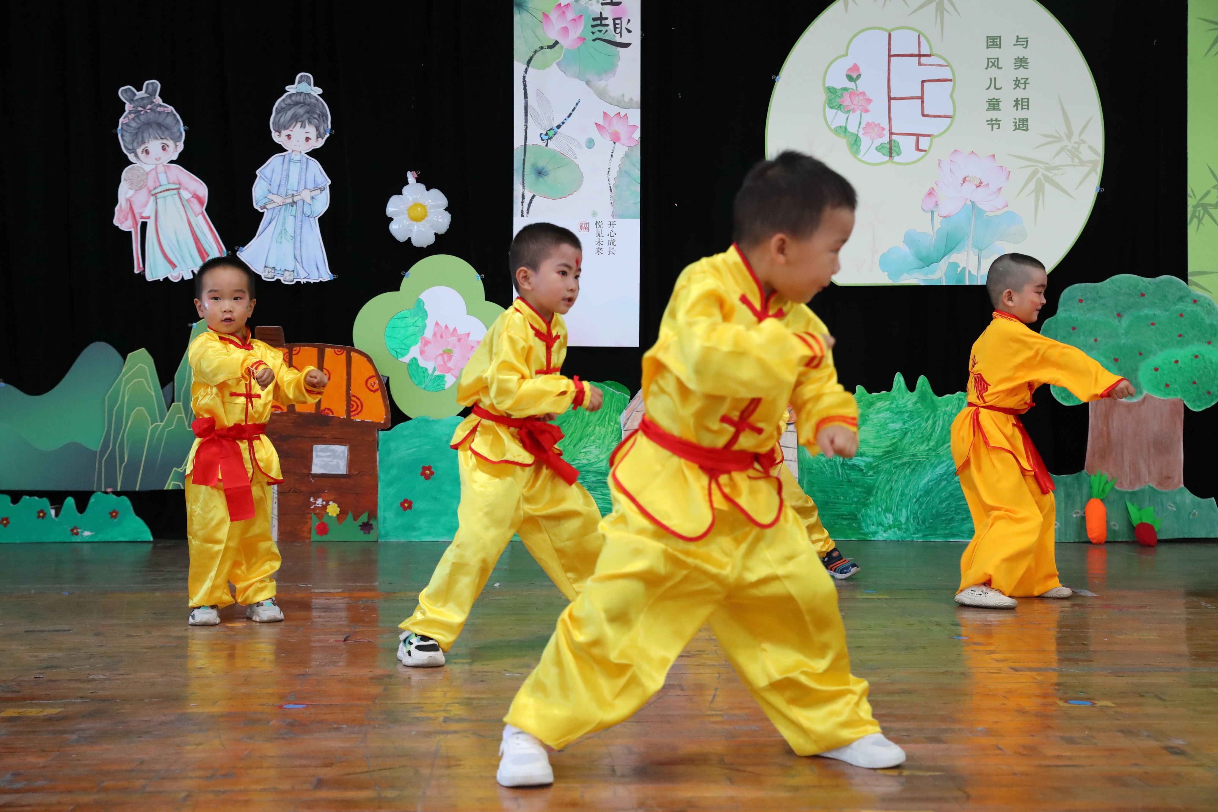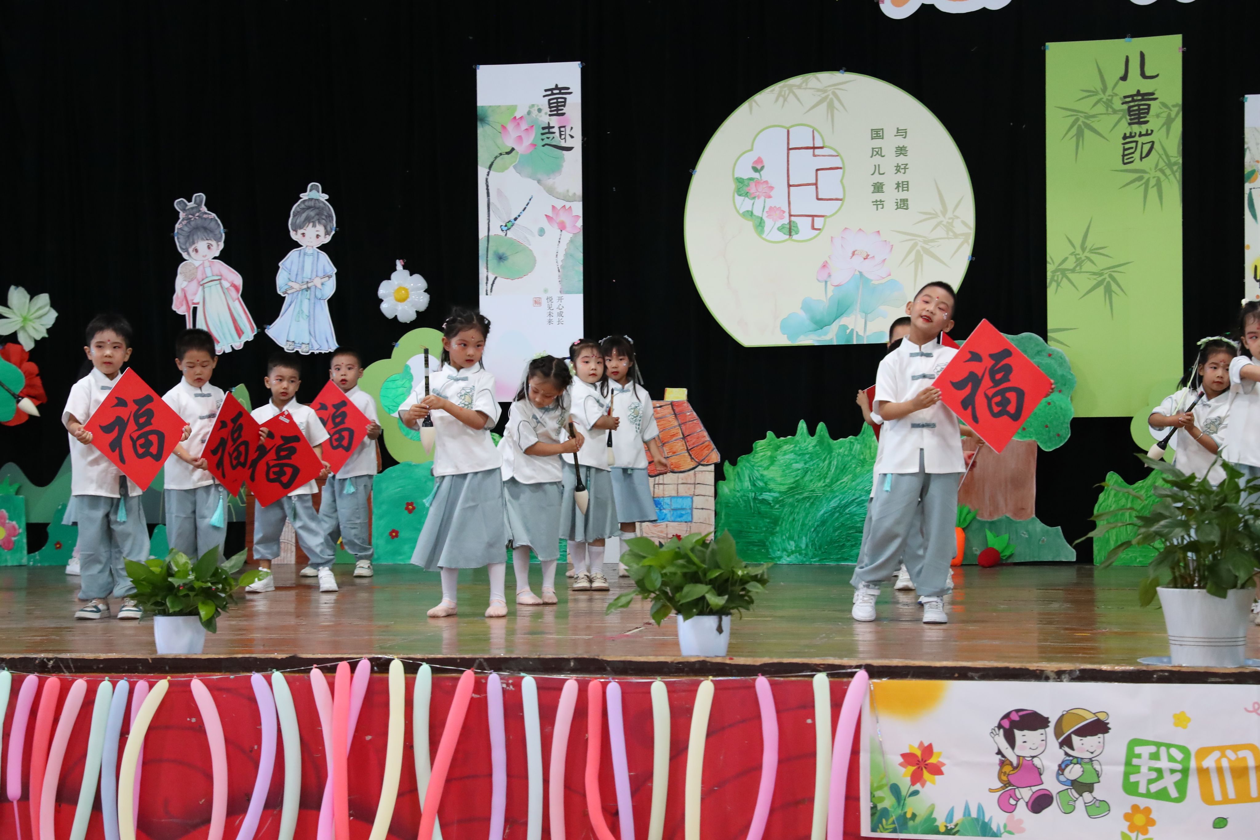 李燕梅园长在致辞中向大力支持幼儿园发展的学校各级领导、家长致以诚挚的感谢,向辛勤耕耘的老师致以崇高的敬意,向孩子们送上真挚的节日祝福!各班教师从幼儿年龄特点出发编排节目,通过诗词国学唱演、舞蹈表演、武术操、情景剧等形式,让幼儿体验传统文化的魅力。演出现场还精心布置展示了孩子们的各类国风民俗作品,吸引了众多家长、老师的驻足。
