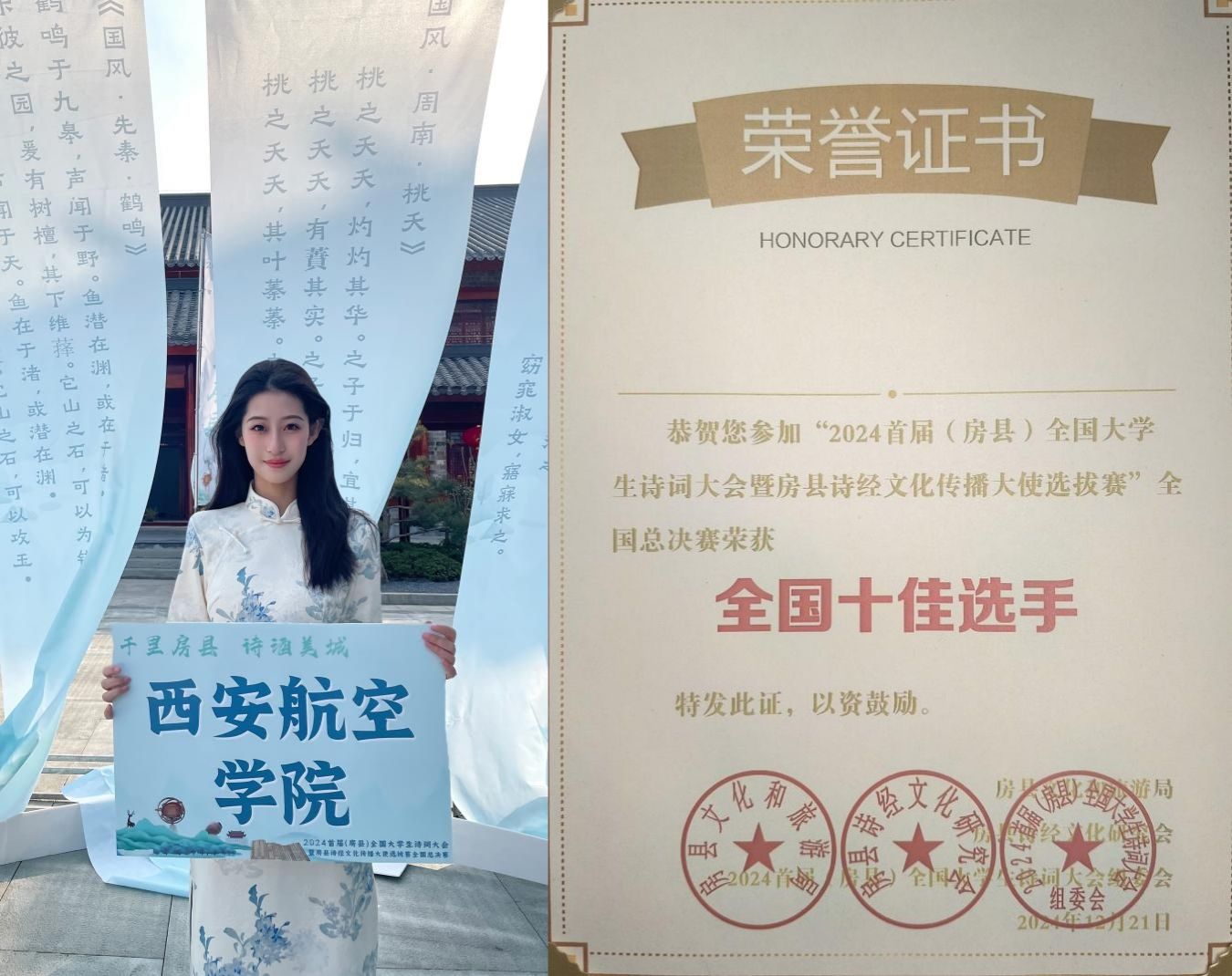 本次比赛历时一个月,在校团委和民航学院团总支的指导下,李润泽、原茵历经长安大学赛区初赛、西北大学赛区半决赛,以情景式朗诵表演入围全国总决赛,最终获得“全国十佳选手”荣誉。他们以《乐土新章:尹吉甫的古今回响》为题生动展现了传统文化底蕴与诗词魅力,其优雅的表达形式和富有感染力的表演获得了评委与观众的一致好评。