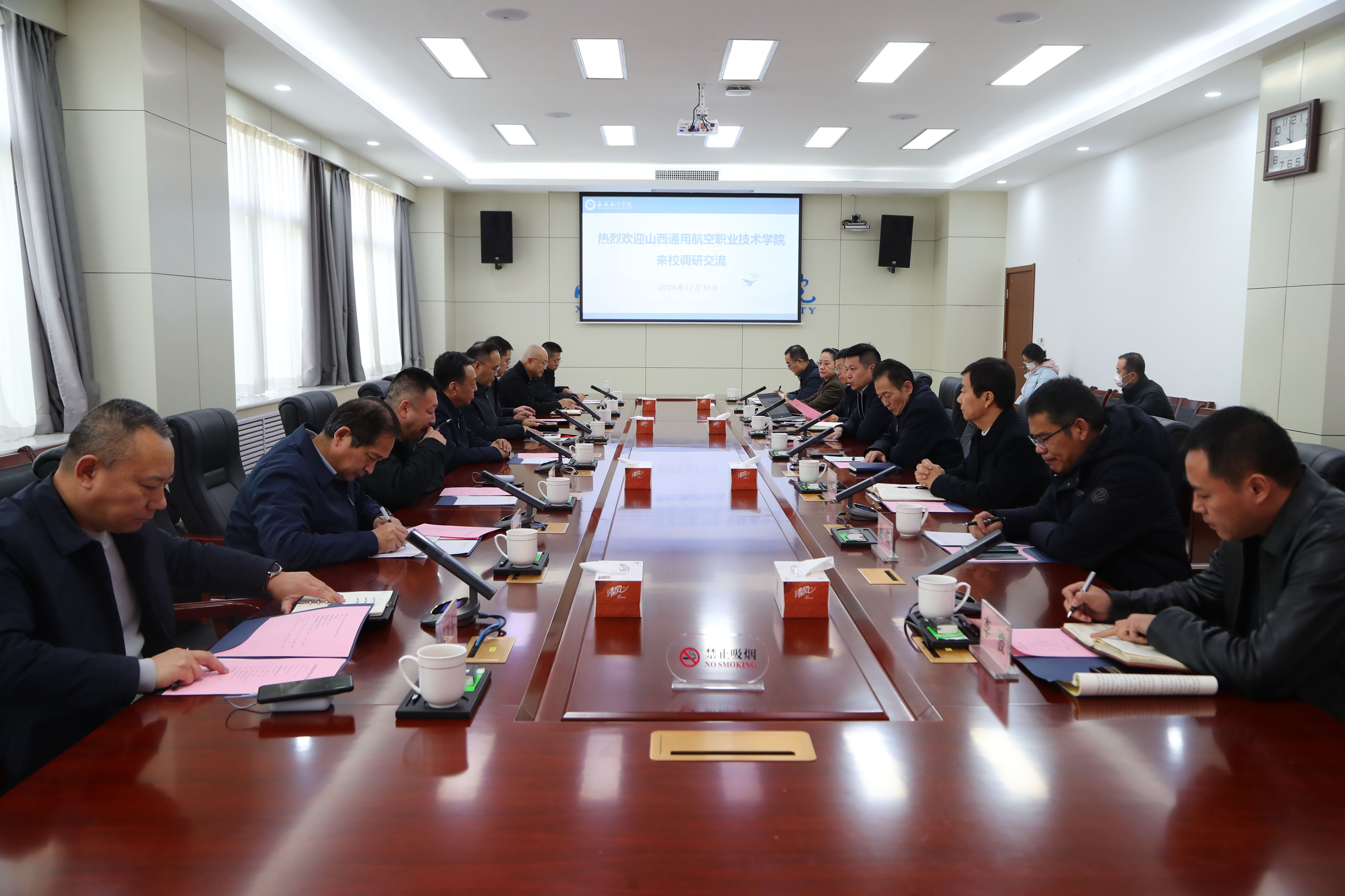 12月30日下午,山西通用航空职业技术学院党委书记王一明、校长阎雷一行来beat365调研交流,学校党委副书记、纪委书记曹渊,党委副书记张昭,副校长宋文学参加调研。曹渊主持座谈会。