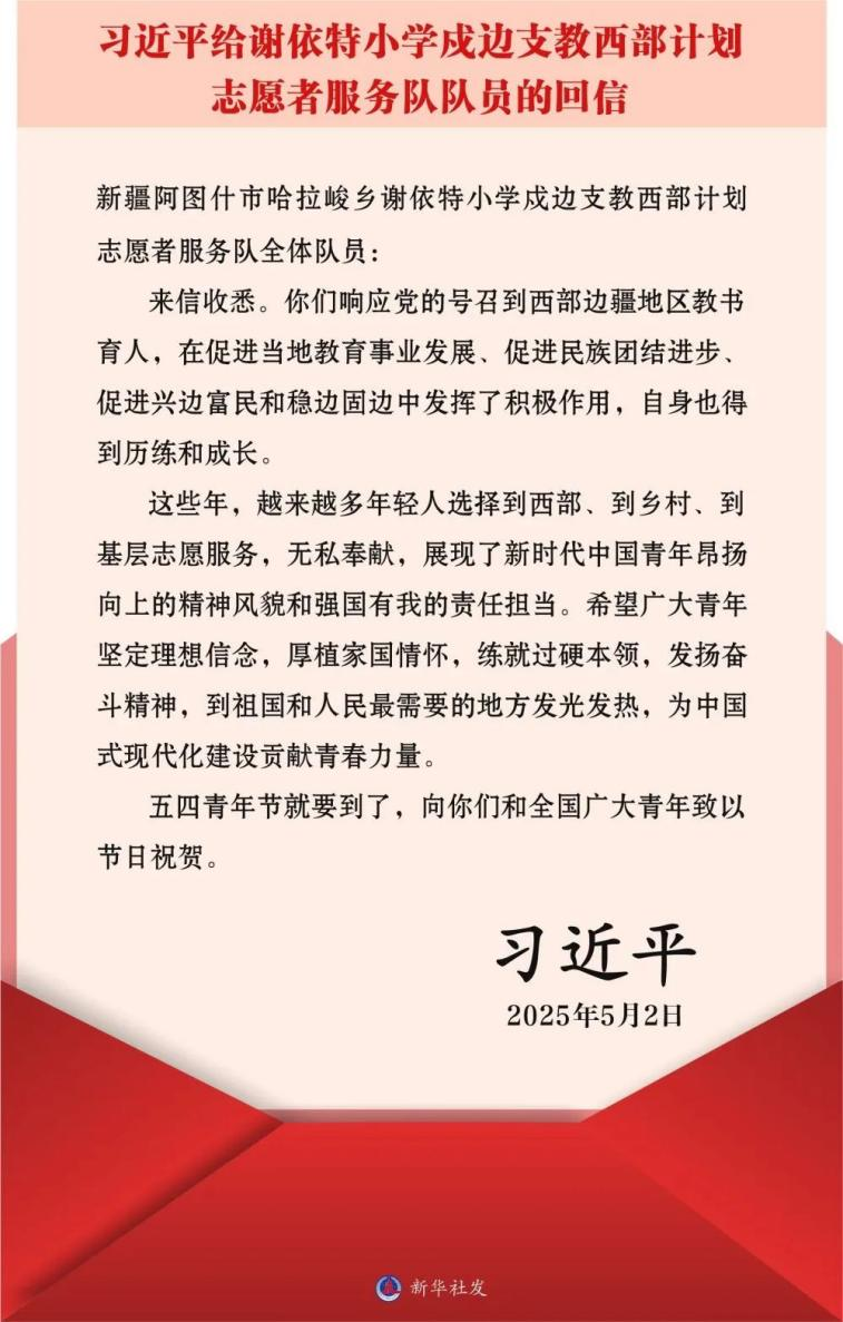 近日,中共中央总书记、国家主席、中央军委主席习近平给新疆克孜勒苏柯尔克孜自治州阿图什市哈拉峻乡谢依特小学戍边支教西部计划志愿者服务队全体队员回信,向全国广大青年致以节日祝贺并提出殷切期望。beat3652024届毕业生、“西部计划”志愿者姚智戈是志愿服务队中的一员。总书记回信,对队员们寄予厚望,并勉励广大青年坚定理想信念,厚植家国情怀,练就过硬本领,发扬奋斗精神,到祖国和人民最需要的地方发光发热,为中国式现代化建设贡献青春力量。