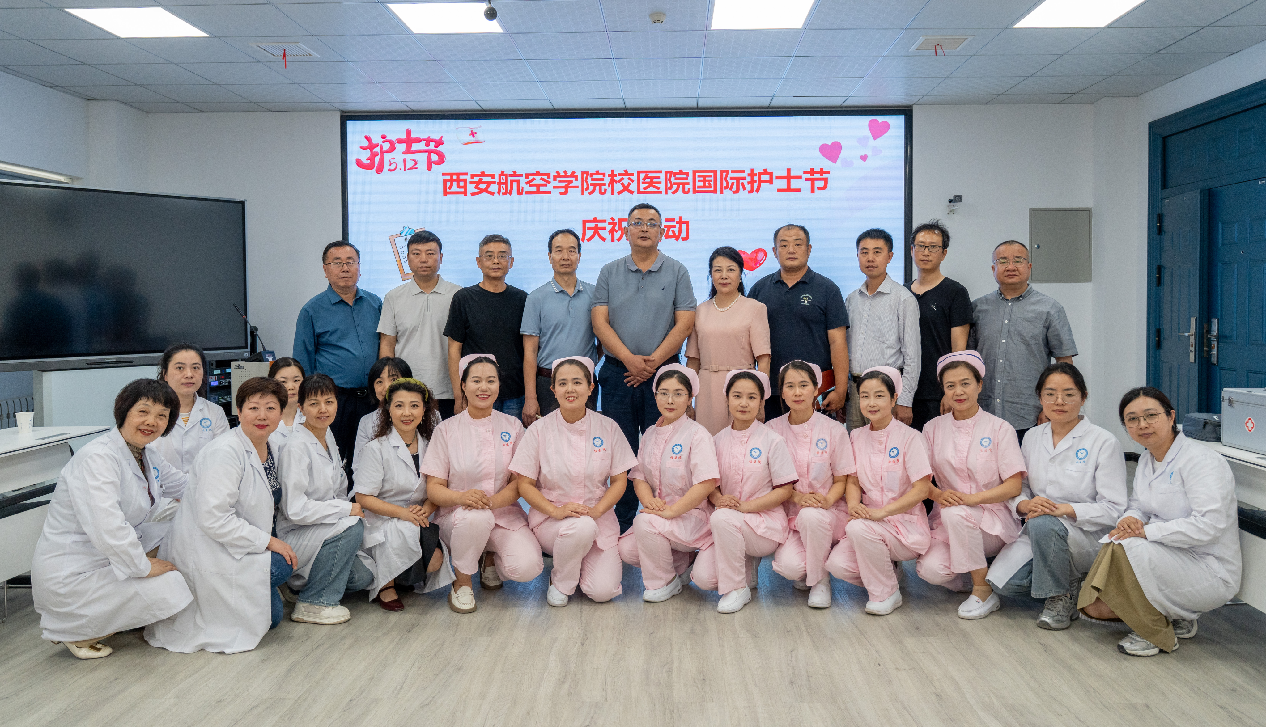 随后,庆祝大会正式举行。主管校领导刘谦、校工会及莲湖校区管理委员会成员单位学生工作部(处)、教务处、保卫处、后勤保障处、图书馆负责人及校医院职工代表30余人出席,活动由校医院副院长杜新洲主持。全体人员通过观看视频《一年来护理工作回望》,回顾了护理团队的工作、学习及团队建设历程。