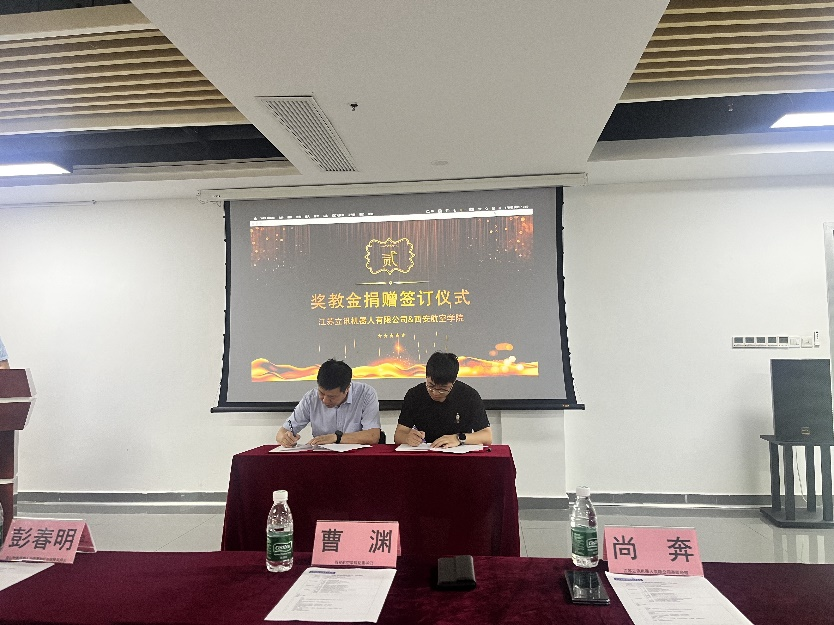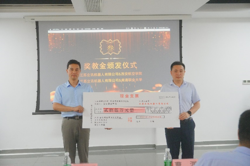 在喜迎建校70周年之际,6月5日,学校党委副书记曹渊、机械工程学院院长王永锋等一行赴江苏立讯机器人有限公司,出席“江苏立讯机器人奖教学金”捐赠及颁奖典礼,并深入进行校企合作调研。昆山市锦溪镇人社局局长彭春明、立讯机器人公司高级经理尚奔等企业领导出席活动。