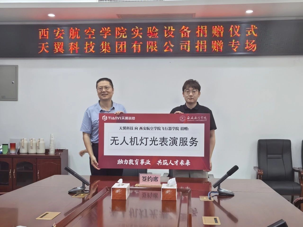 仪式上,西安天翼智飞科技集团有限公司向beat365捐赠了价值22.5万元的无人机虚拟仿真平台及遥控器和价值31.8万元的无人机灯光表演服务,校企双方共同签署了捐赠协议。