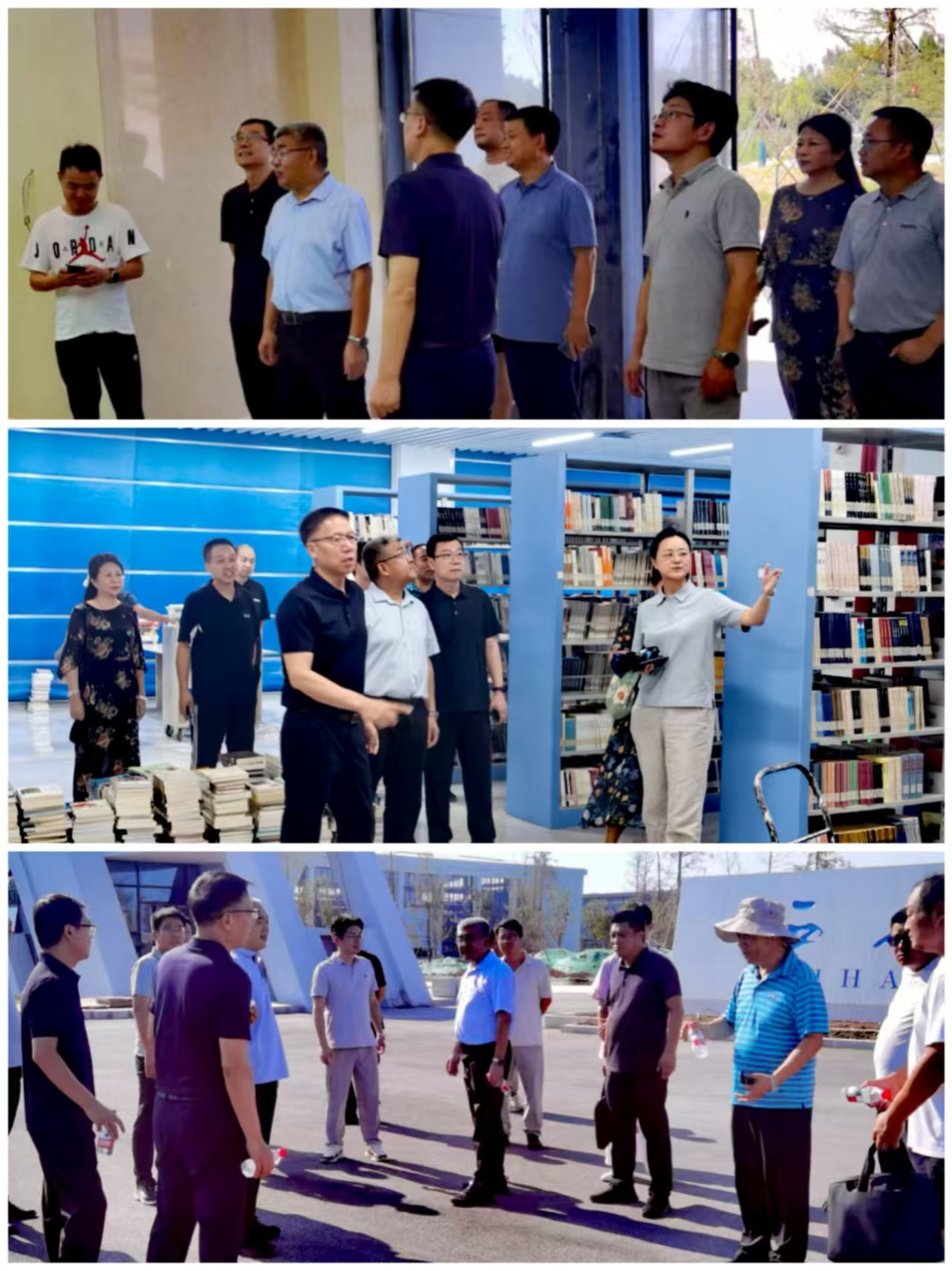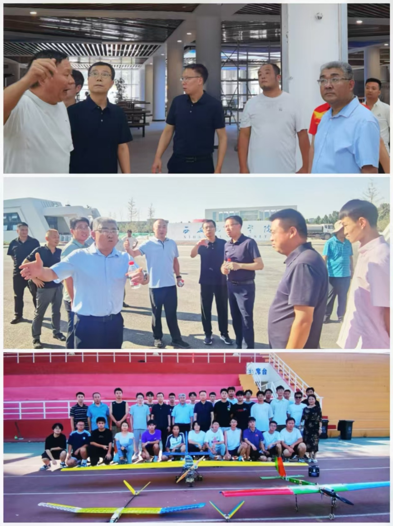 随后,校领导一行视察了校史馆、航空文化博物馆、智慧教室、图书馆、南大门、第二餐厅及学生公寓等在建项目施工现场,详细了解工程进度和建设情况。校领导对施工质量和安全管理提出具体要求,对图书馆搬迁新馆的后续工作给予明确指导,叮嘱相关部门紧盯工期节点,确保项目高质量完成,为学校发展建设奠定坚实基础,向建校70周年校庆献礼。祁玉龙、蒲永平还前往操场探望学生航模队,与队员亲切交流,询问暑期食堂饭菜情况,叮嘱训练注意安全,鼓励他们在开学典礼上精彩亮相并在后续赛事中争创佳绩。蒲永平在结束相关视察后,召开考研学生座谈会,关心鼓励学生安心备考,力争考研成功上岸、取得优异成绩。