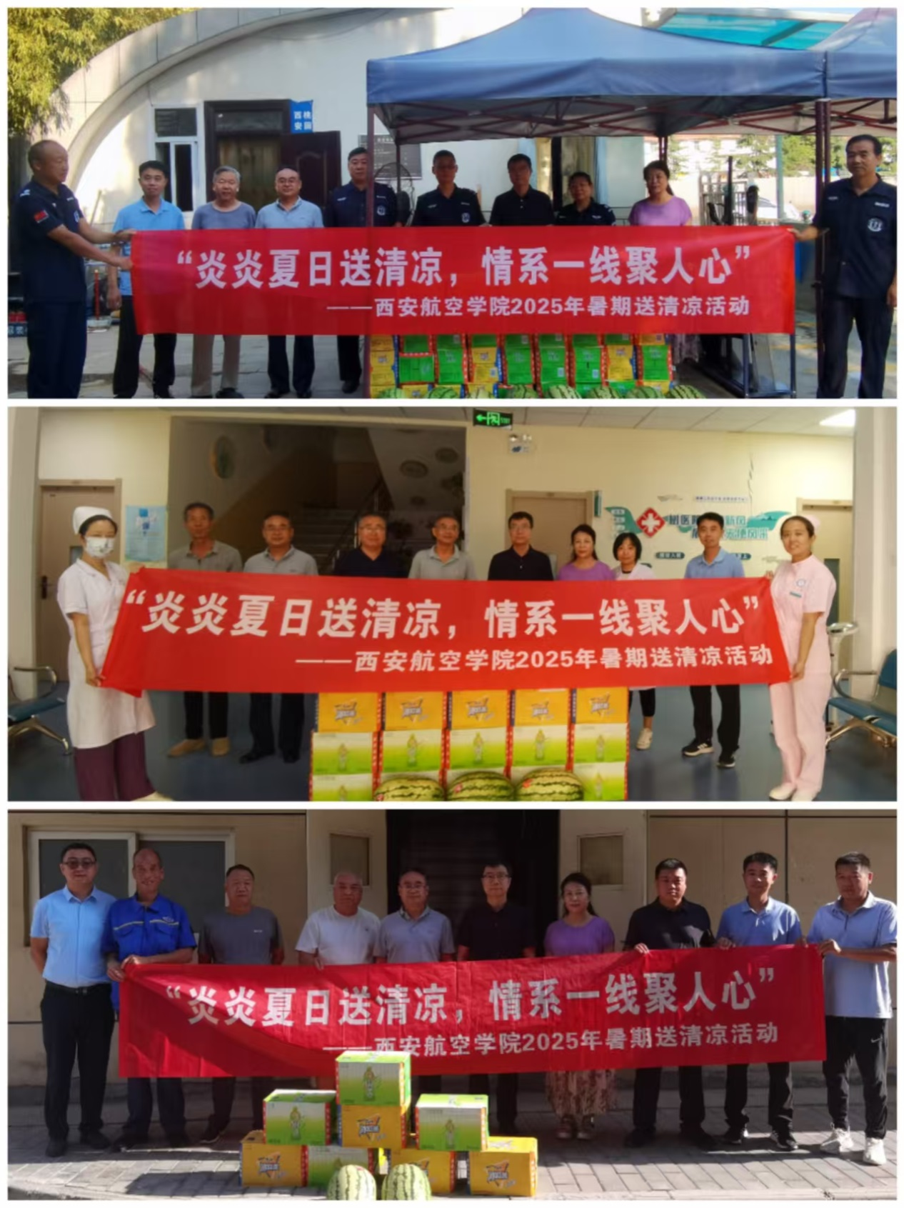 8月12日至13日,学校开展“炎炎夏日送清凉,情系一线聚人心”暑期送清凉慰问活动。党委书记祁玉龙、校长蒲永平、副校长李永刚带队分别赴莲湖、阎良两校区,为暑期坚守在教学科研、学科竞赛、招生录取、后勤保障、基本建设、安全保卫、网络信息、交通运输等岗位的教职工送去清凉物资和亲切问候。