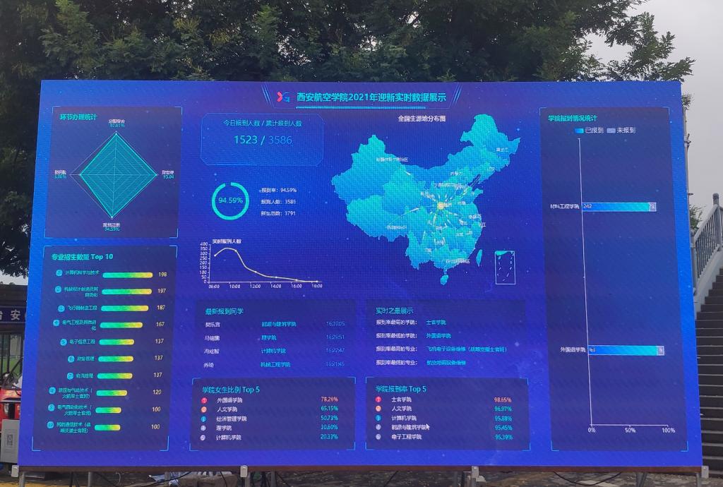 数字迎新、提升效率。“数字化迎新系统”帮助新生“一站式”办理学籍注册、学费缴纳、宿舍分配等手续,迎新系统手机客户端、数字大屏实时向师生反馈新生报到进展,各学院各专业报到率、男女比例一目了然,新生入校体验感进一步增强。