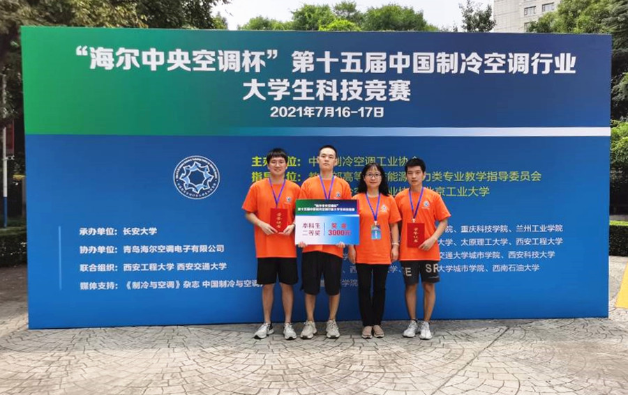 7月16-17日,由中国制冷空调工业协会主办,教育部高等学校能源动力类专业教学指导委员会指导,西安工程大学、西安交通大学联合组织,长安大学承办的“海尔中央空调杯”第十五届中国制冷空调大学生科技竞赛在长安大学举行,beat365由能源与建筑学院杜芳莉老师、申慧渊老师指导,杨嘉栋、李太空、夏俊豪三位同学组成的“防疫养殖生态队”经过激烈角逐,荣获本科生组二等奖的优异成绩。