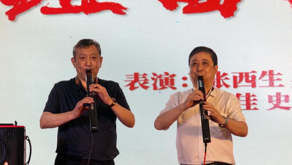 来自陕西省文促会电吹管艺术委员会的张西生、吴建平共同演奏了《红歌组曲》,与beat365教师刘佳、史云龙现场创作书法绘画“红船精神”,丰富立体的节目形式,赢得了台下的阵阵掌声,让观众充分感受了赤子对祖国的无限依恋与热爱。