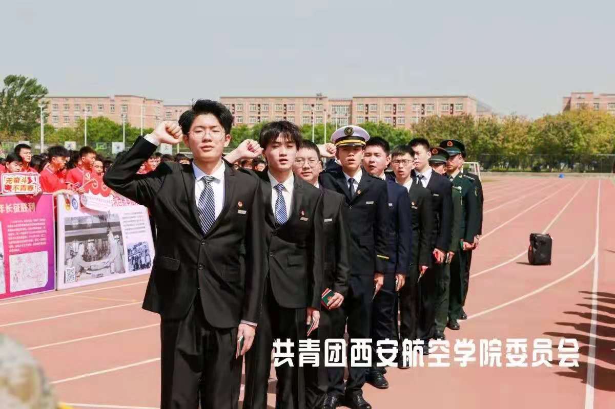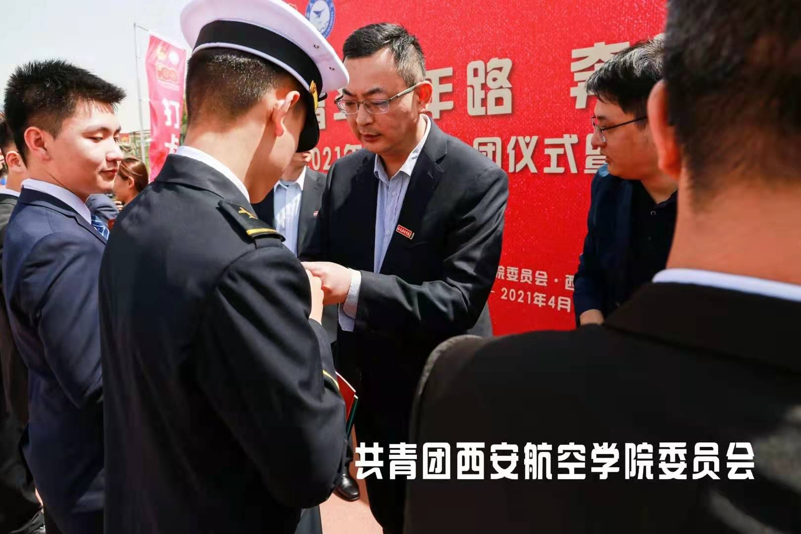 首先进行的是2021年新团员入团仪式。本次入团仪式严格按照共青团中央2021年4月28日发布的入团仪式基本程序进行。仪式在庄严的国歌声中拉开帷幕,校团委副书记季林健宣布了新团员名单。校团委学生兼职副书记周争涛同学带领全体新团员面对团旗庄严宣誓。刘谦及阎良校区各学院党总支书记为新入团团员颁发团章、团员证并佩戴团徽。