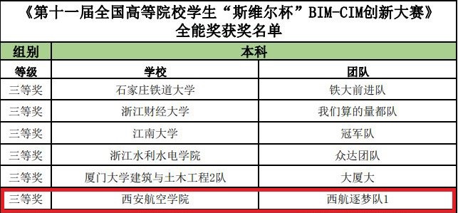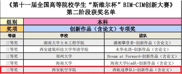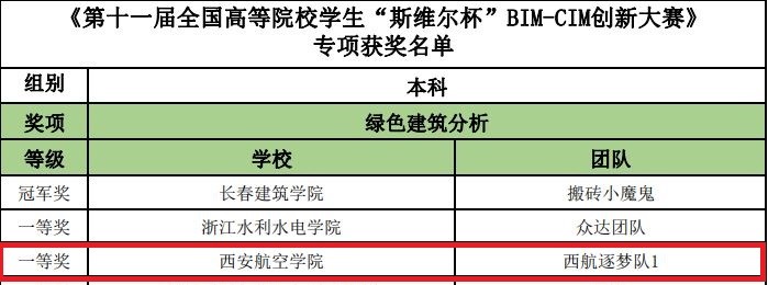 近日,由中国建设教育协会主办,深圳市斯维尔科技有限公司、湖南大学承办的中国建设教育协会第十一届全国高等院校“斯维尔杯”BIM-CIM创新大赛第二阶段决赛线上答辩结果公布。由能源与建筑学院权张涛、王虎星、唐烨、裴冲、李佳乐五名学生组成的beat365西航逐梦队取得了绿色建筑专项一等奖、规划设计专项三等奖、工程管理专项三等奖、第一阶段全能三等奖、第二阶段创新作品三等奖的佳绩,在陕西参赛院校中名列前茅。