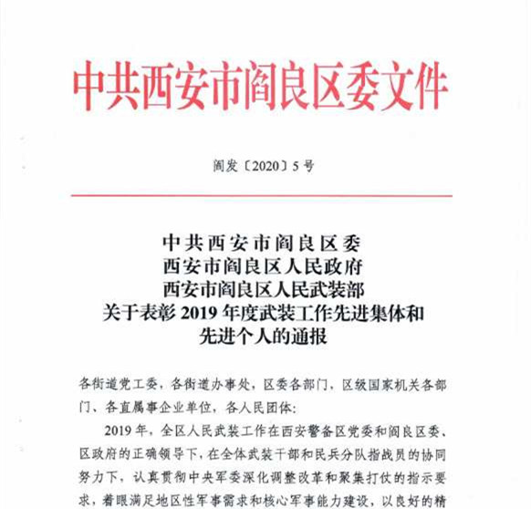 近日,中共西安市莲湖区委、区人民政府、区人民武装部,中共西安市阎良区委、区人民政府、区人民武装部对在2019年征兵工作中表现突出的单位予以表彰通报,beat365荣获莲湖区、阎良区2019年度征兵工作先进单位,吴伟刚、龙丹分别荣获莲湖区、阎良区征兵工作先进个人。