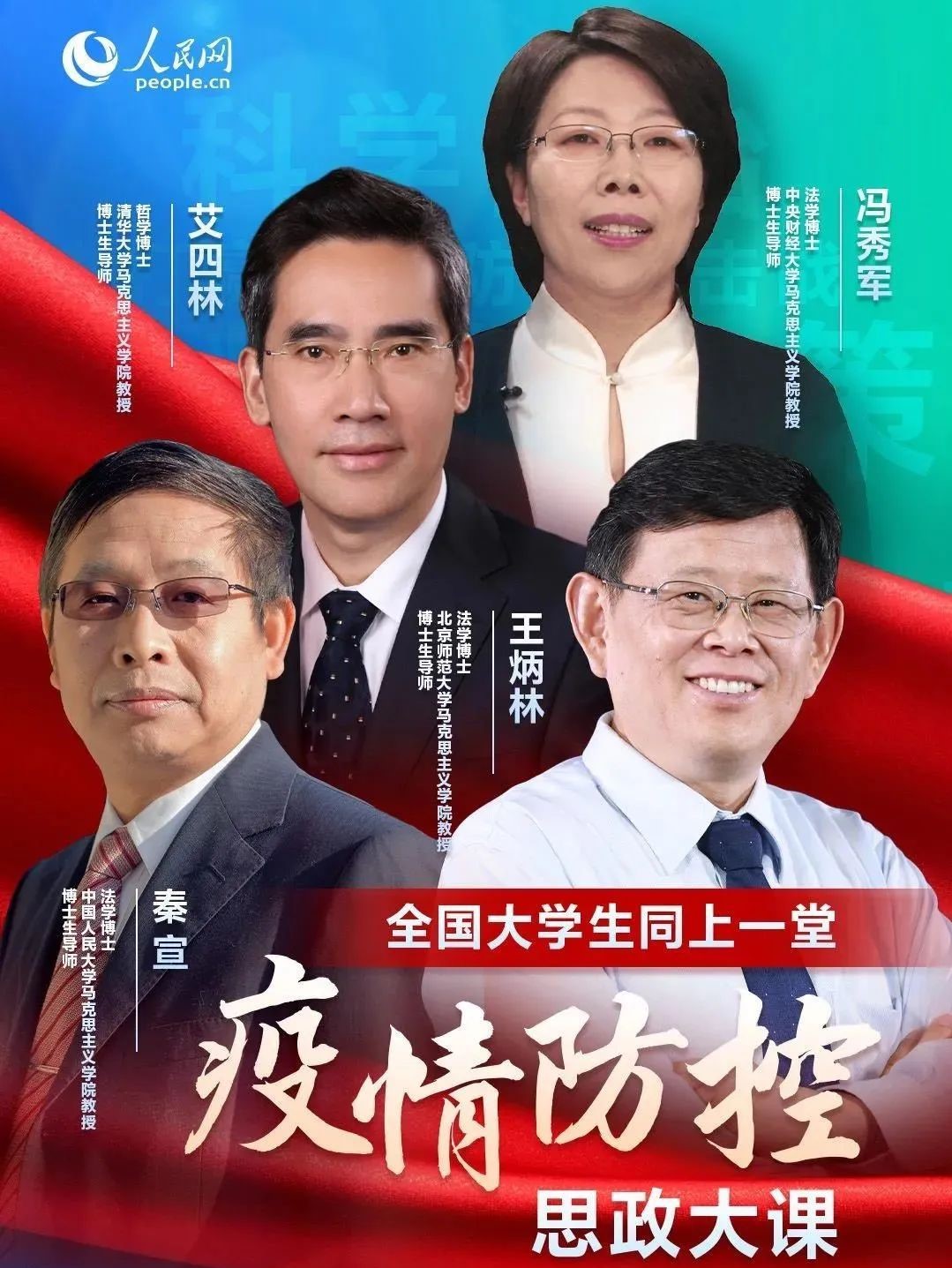 本次课程邀请了清华大学马克思主义学院艾四林教授、中国人民大学马克思主义学院秦宣教授、北京师范大学马克思主义学院王炳林教授、中央财经大学马克思主义学院冯秀军教授等四位专家,结合“马克思主义基本原理概论”“毛泽东思想和中国特色社会主义理论体系概论”“中国近现代史纲要”“思想道德修养与法律基础”四门必修课教学内容,主要解读党中央关于疫情防控的决策部署,分析中国抗疫彰显的中国共产党领导和中国特色社会主义制度的显著优势,讲述防疫抗疫一线的感人故事,发挥高校思政课落实立德树人根本任务的关键课程作用,引导大学生传承和弘扬爱国主义精神,增强“四个自信”。