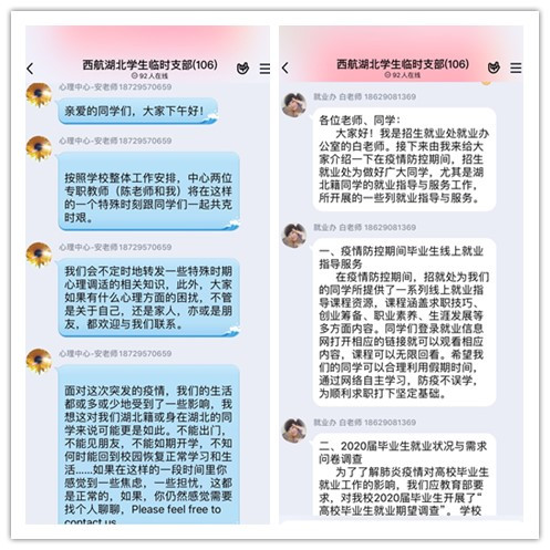 学生工作处(部)联合各二级学院,组织疫区学生开展每日健康打卡活动,形成了以“学生为中心,网络为纽带,学院为抓手”的实时数据监管平台,为学校制定开学时间形成数据支撑,每日健康打卡率保持99.7%以上;安排专任心理咨询教师加入团支部,发送特殊时期心理调适的相关知识,并对有需要的学生开展一对一心理咨询和帮助,同时开展“‘疫’路有你”、“看看你是什么颜色”等心理主题微团课和线上互动,为湖北学生在疫情防控期间的身心健康保驾护航。招生就业处制作提供了一系列线上就业指导课程资源,采取电子邮件、信函、短视频等方式帮助学生投递简历,组织学生在线笔试面试,并于3月上旬组织召开2020届毕业生网络视频双选会,针对湖北学生通过团支部安排专人建立一对一线上联系,了解学生需求、回答疑问、解决难题,对毕业生的就业焦虑和就业困惑及时做好心理疏导,确保2020年就业工作的顺利进行。