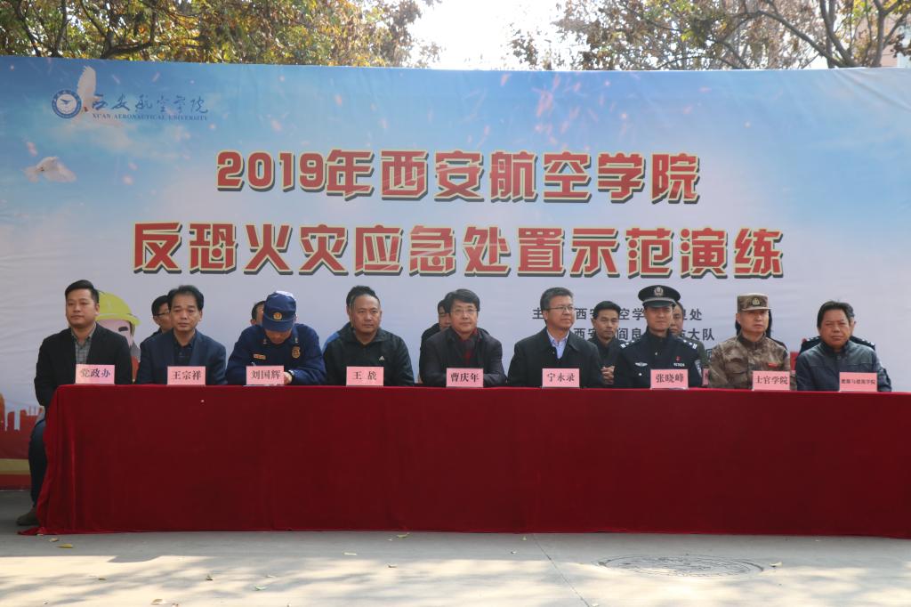 11月21日,2019年beat365英国官网网站反恐火灾应急处置示范演练在阎良校区举行。校长曹庆年、副校长宁永录,西安市公安局阎良分局国保大队、蓝天路派出所、西安市阎良区消防大队,学校保卫处、党政办、教务处、学生处、校团委、后勤保障处、校办工厂、图书馆及阎良校区各二级学院有关负责人及300余名师生现场观摩演练。演练由保卫处主办,士官学院及能源与建筑学院承办。