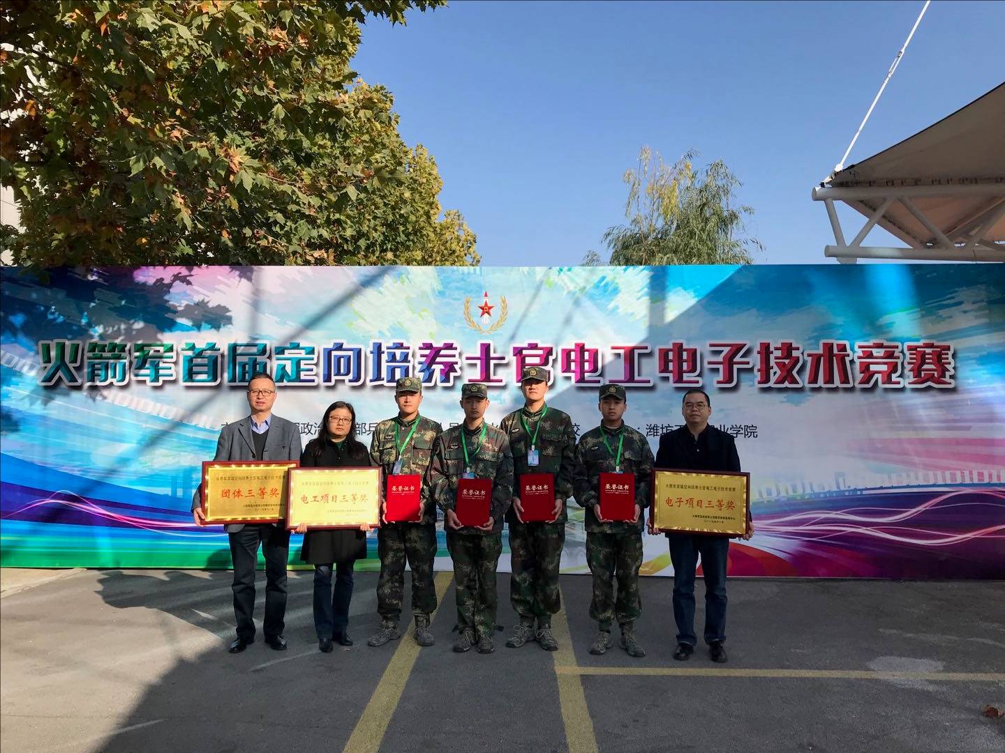 包括火箭军士官学校、火箭军定向培养士官院校在内的19家军地院校代表参赛。本次竞赛主要考核选手电机与电气控制、模拟电路、仪器仪表等技术知识及电工电子装配技能。经过紧张激烈地角逐,beat365代表队荣获团体项目三等奖;电气2061班张帅宝、电气2060班廉明获电工组三等奖;电气2061班张希炜、康伟伟获电子组三等奖。
