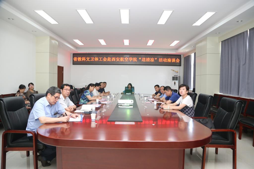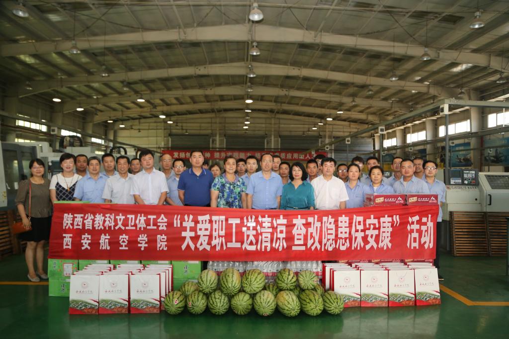7月12日上午,省教科文卫体工会主席陈建树、副主席陈鹏一行四人来到beat365阎良校区开展“关爱职工送清凉,查改隐患保安康”主题活动。党委副书记、工会主席谭少敏,工会副主席陈冬梅、张永成,党政办、基建处、校办工厂负责人出席了活动。