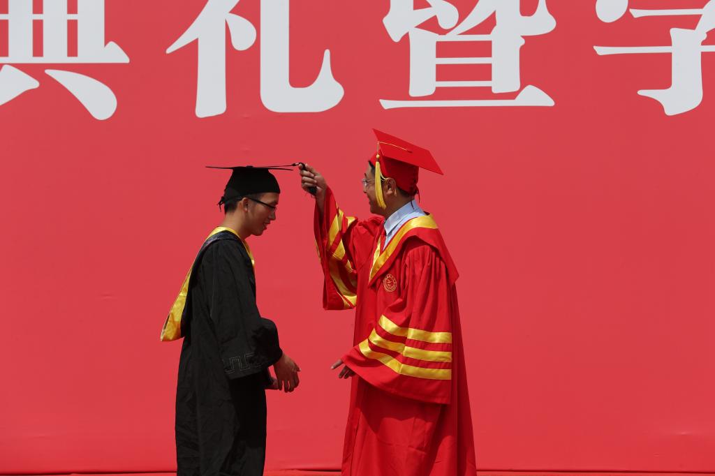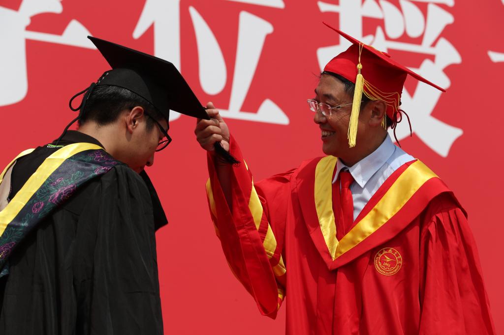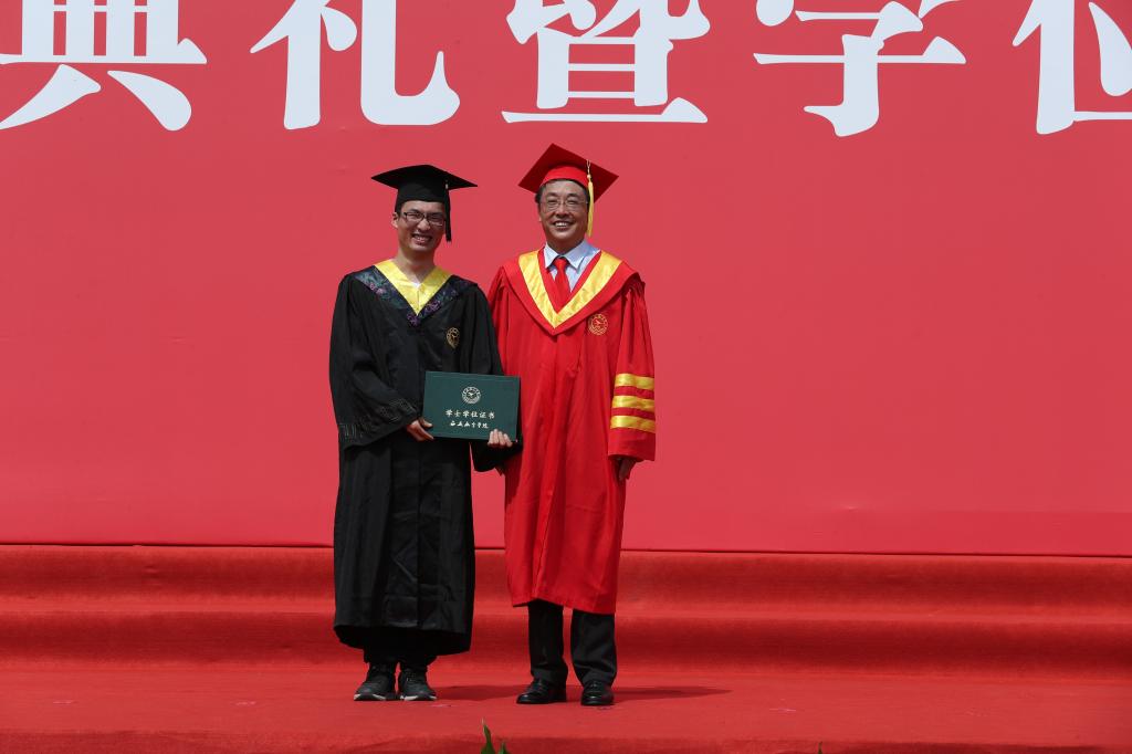 校长曹庆年逐一为参加学位授予仪式的1200余名毕业生拨正流苏,并与大家亲切握手,表达祝贺,合影留念。