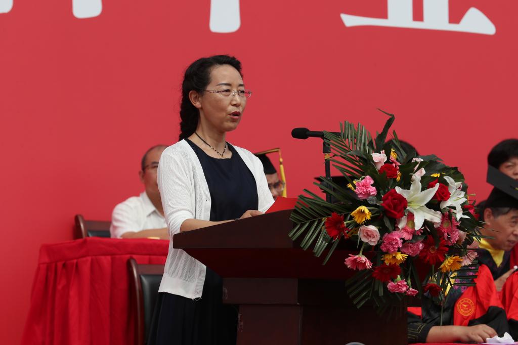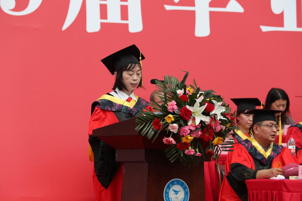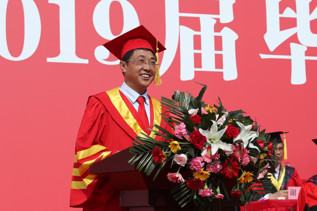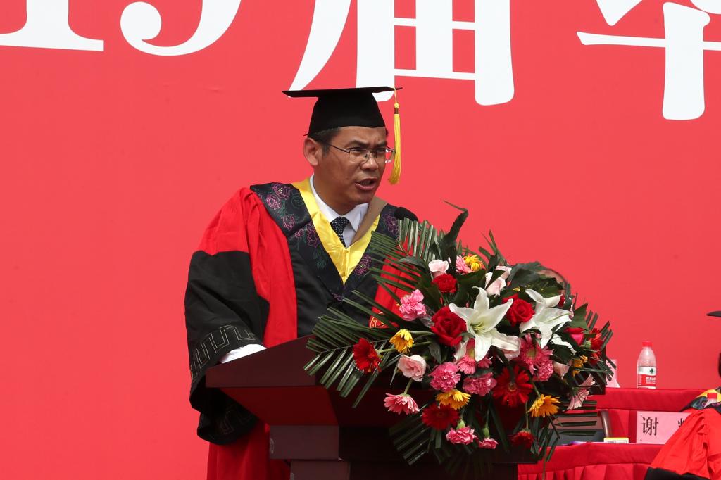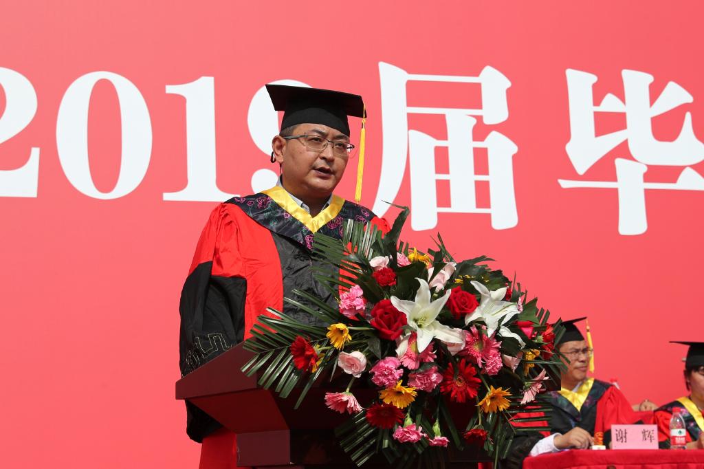 省级教学名师、材料工程学院院长谢辉教授代表全体教师对2019届毕业生送上诚挚祝贺、祝福,向同学们提出与时代融合发展、积极面对生活、知晓人生真谛、关注个人健康的临别赠言。