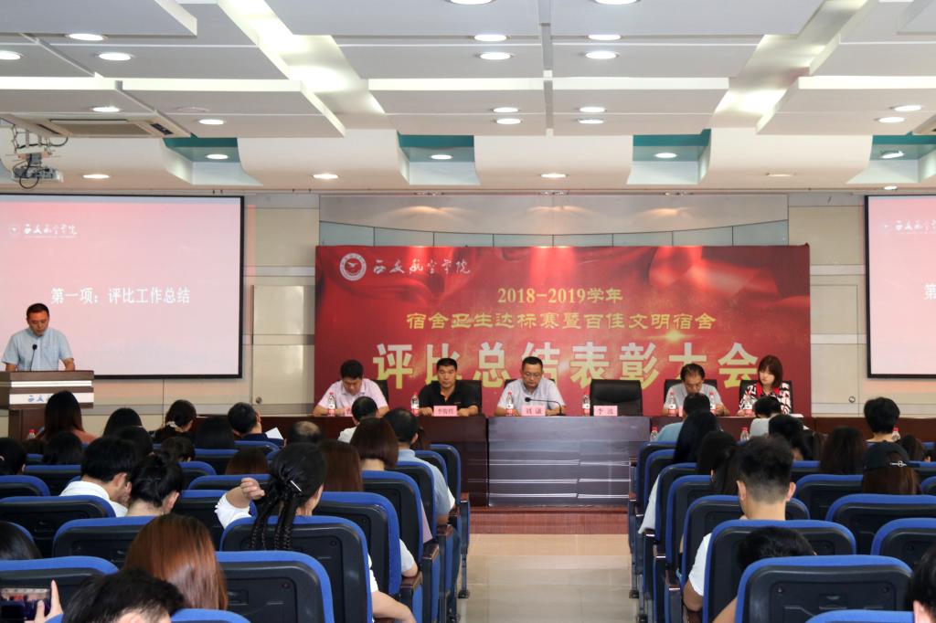6月26日,学校在沣惠校区召开2018-2019学年“学生宿舍环境卫生达标赛暨百佳文明宿舍”评比总结表彰大会。党委副书记刘谦,学生工作部(处)、后勤保障处、保卫处、教务处、校团委等职能部门负责人,各二级学院党总支书记、学生管理科科长、辅导员及学生代表共200余人参加了此次大会。会议由学生工作部副部长赵琳主持。