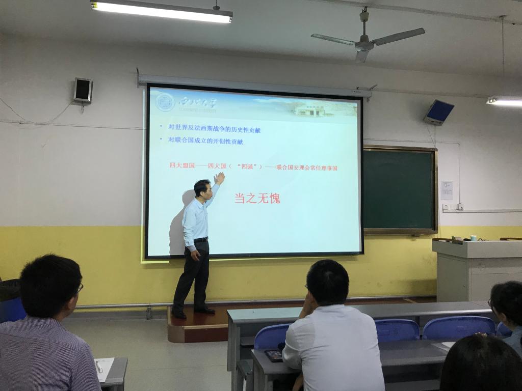 为进一步贯彻落实习近平总书记在全国教育大会和学校思想政治理论课教师座谈会上重要讲话精神,根据教育部相关文件和陕西省委教育工委、陕西省教育厅《陕西学校“四好”思政课创优行动方案》通知要求,6月21日上午,马克思主义学院组织开展了思政课示范教学活动。活动邀请全国学校思想政治理论课教师座谈会参会代表、全国高校思想政治理论课教学能手、陕西省高校思想政治理论课教学标兵、西北大学马克思主义学院中国近代史纲要教研部主任苟昭赟老师来校作教学示范与交流,马克思主义学院专兼职教师参加了本次活动。