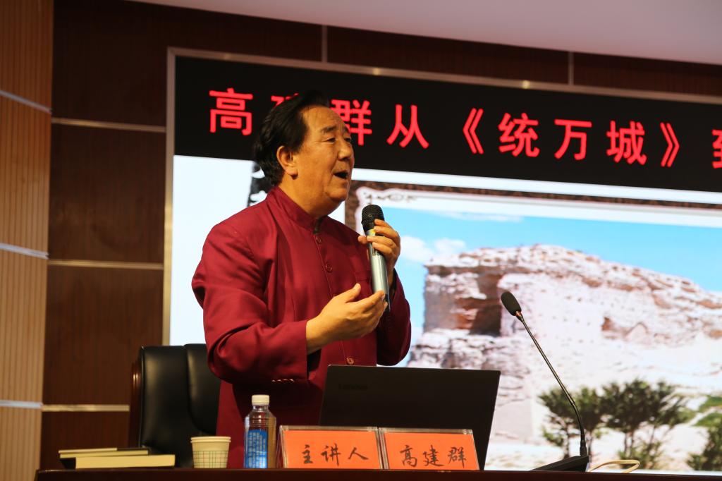 每场讲座首先由刘华阳介绍这次活动以及选题的意义,然后高建群做“从《统万城》到一带一路”主题讲座。高建群的讲座内容分两大部分,上半部分从大历史的角度介绍统万城作为五胡十六国时期匈奴大夏国最后的都城,也是匈奴民族在人类历史长河中所建造的一座非常重要的都城的建城原因;从大地理的角度说明统万城遗址的地理位置,历史意义;从大文化的角度讲述匈奴民族的变迁、兴衰以及写作长篇小说《统万城》的动机和社会意义。下半部分以一个文化大使的责任和担当,从文化人的大视野,带领大家从西安出发,经甘肃、新疆,到中亚、西亚、欧亚各国,历经22000多公里,和大家分享了他在“丝路万里行”的经历、感受、沿途的人文历史风貌以及他自己独特的所见所闻、所思所想,为大家奉上了丝绸之路上风味独特的一场文化盛宴。每每讲到动情处,高老师还会用他最真挚的情感为大家吟诵著名诗人海涅、普希金的代表诗歌,震撼人心,赢得了阵阵掌声。