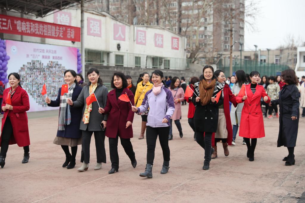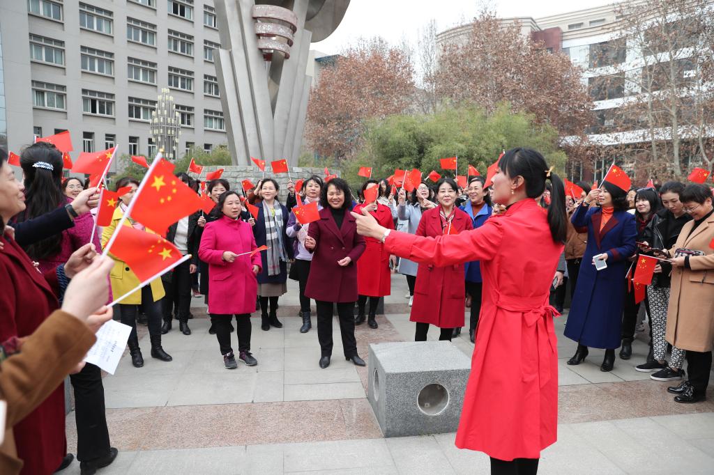 女教职工们首先在运动场集合出发,大家一起迎着春风,欢声笑语,你追我赶、健步如飞,绕着校园健步走,途径花园与主教学楼广场时,女教工们有感而发,手持小红旗欢唱歌曲《我和我的祖国》,在优美的旋律下,大家用柔美的歌声抒发爱国情怀。