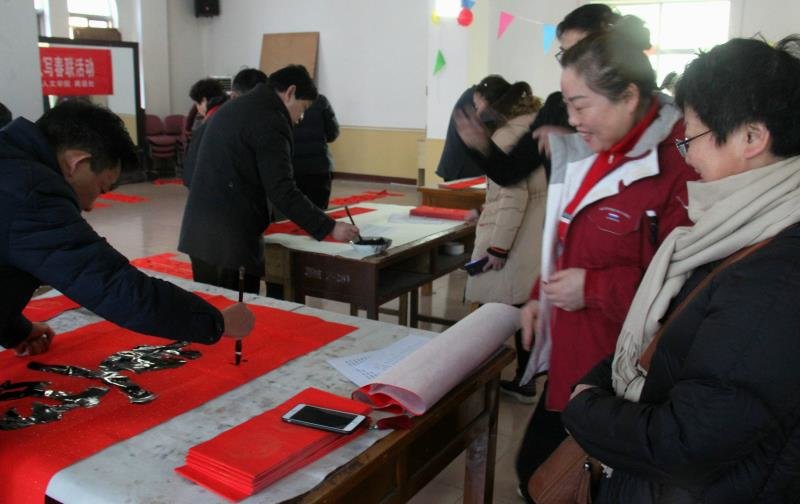 1月11日下午,在猪年新春佳节来临之际,校工会联合人文学院、离退处共同开展了“迎新春送祝福”春联义写活动。由学校书法爱好者包安源等7位老师在教职工之家为教职工现场书写春联,为全校师生及镇坪对口帮扶户送上最温馨的祝福。