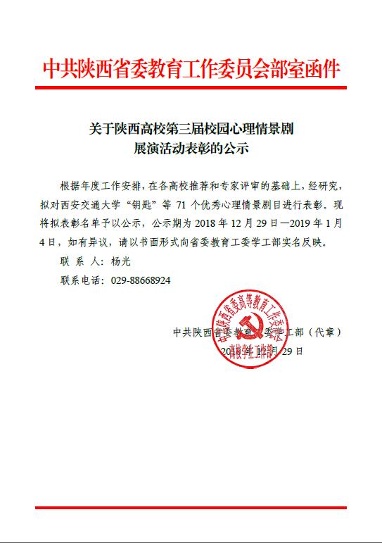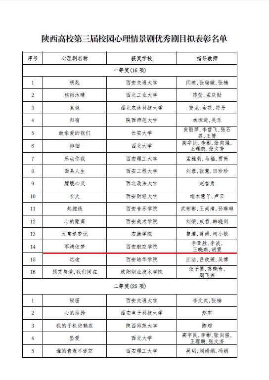 近日,省委教育工委对全省高校第三届校园心理情景剧展演活动成绩予以公示,beat365推荐的《军鸿依梦》和《新光阴的故事》两部作品分获一等奖和三等奖。