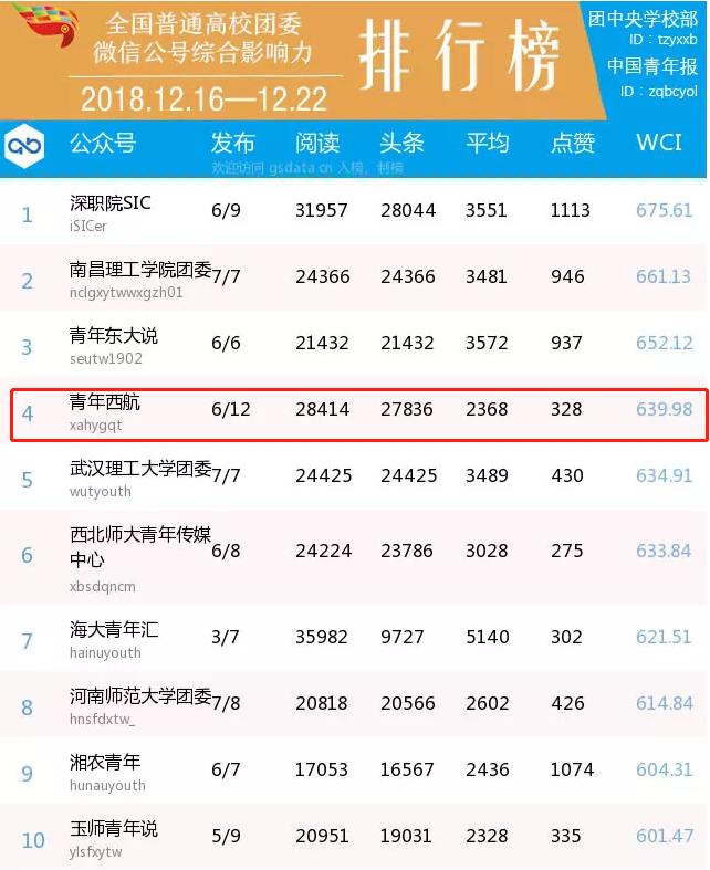 近日,《全国普通高校团委微信公号综合影响力排行榜》及《全国普通高校团委单周文章阅读量百强榜》相继公布排名,beat365团委官方微信“青年西航”入榜,排名全国高校第4名,微信传播WCI指数639.98;原创推文《纪念改革开放四十周年“唱响新时代,建功新西航”歌咏比赛》荣获单周文章阅读量第1名,阅读量25919次,点赞328次,关注度和社会影响力显著提升。