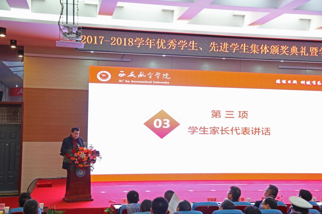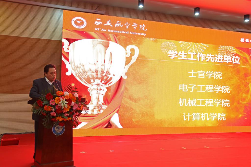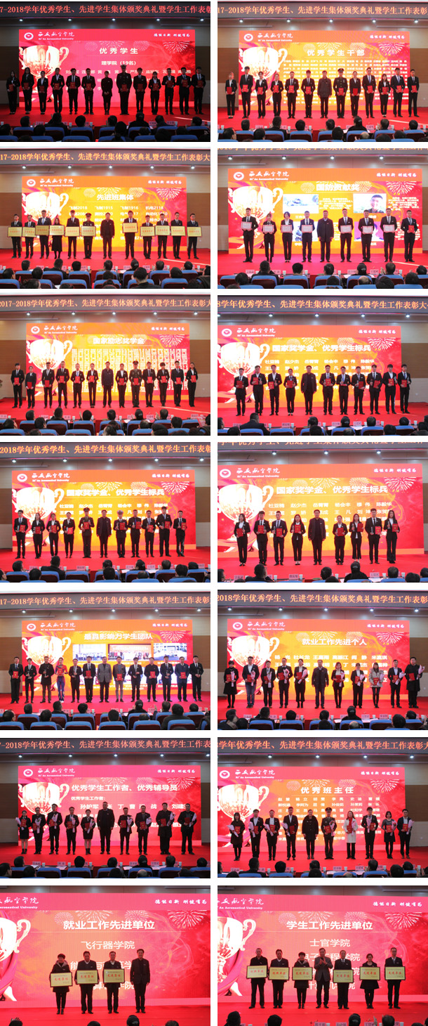 颁奖典礼在气势磅礴的《西航学子颂》中拉开了帷幕,分“激情进取、志在超越”“航空报国、立德树人”两个篇章。上篇颁发了国家奖学金、优秀学生标兵、国防贡献奖、优秀学生、优秀学生干部、先进班集体、最具影响力学生团队荣誉。下篇对学生工作先进单位、学生工作创新单位、就业工作先进集体、优秀学生工作者、优秀辅导员、就业工作先进个人、优秀班主任获得者进行了表彰。国家奖学金获得者王潇的父亲王志成、车辆工程学院学生刘雨萱、能源与建筑学院党总支书记刘剑坤分别代表学生家长、优秀学生、学生工作先进单位及就业工作先进单位发表获奖感言,分享在家庭教育、学习、工作中的经验心得。