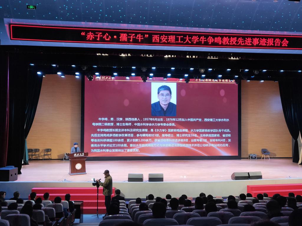 报告会上,由西安理工大学水利水电学院党委书记程文、水利水电学院水力学研究所副所长王雯、水利水电学院青年教师李奇龙、长期在西安理工大学务工的农民工朋友马鹏举以及党委宣传部副部长王凌云组成的宣讲报告团深情讲述了牛争鸣教授为教育事业奉献一生的先进事迹。