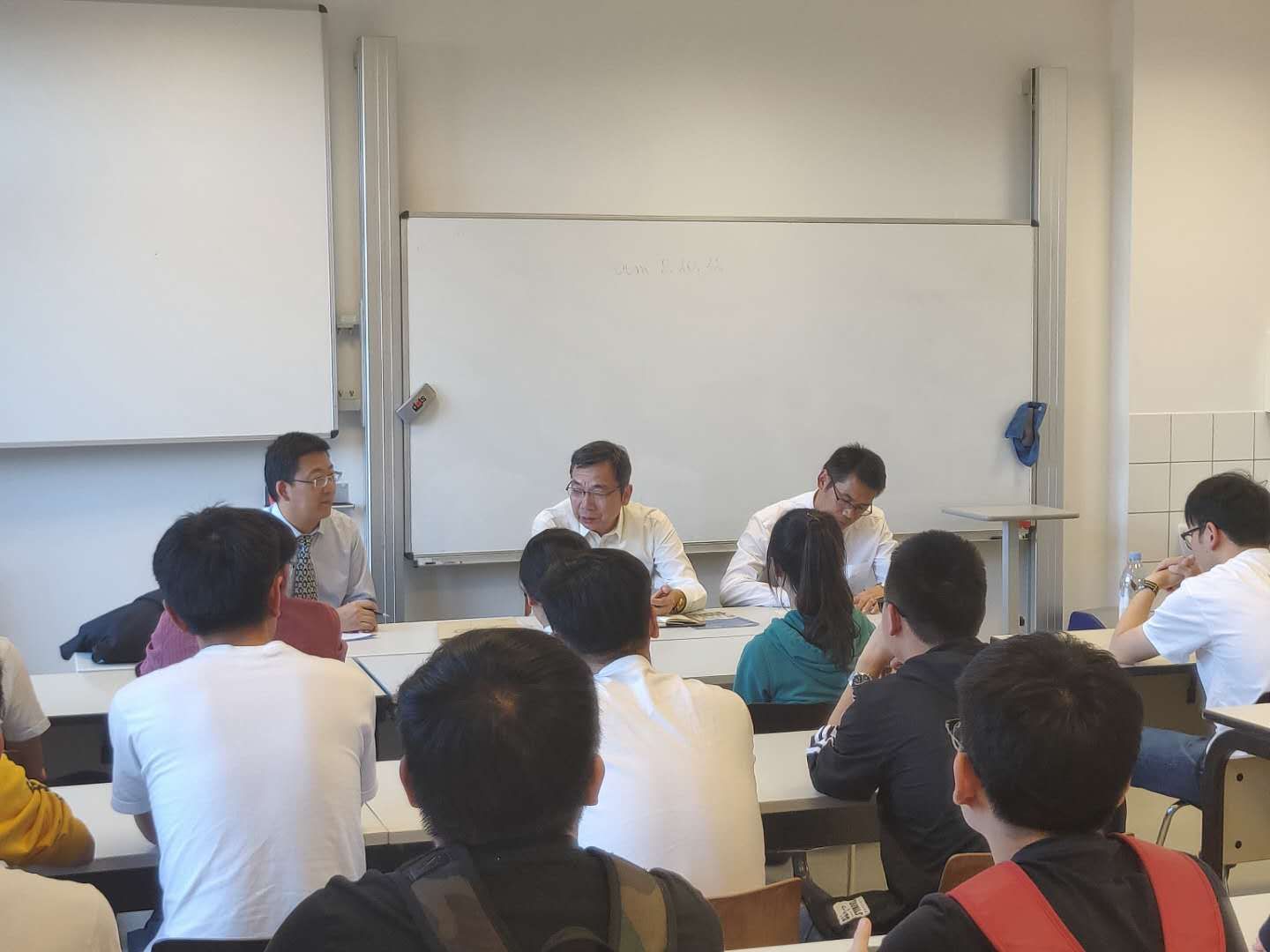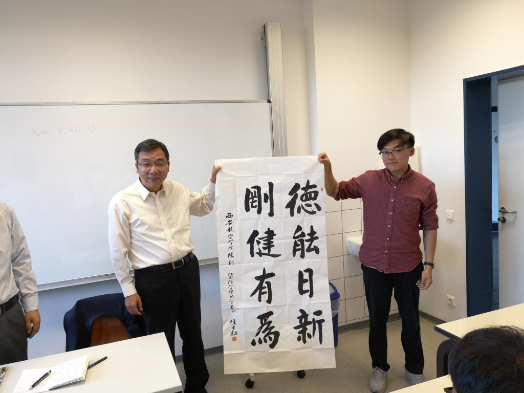 陈平社一行还专程看望了beat365中德合作班在德学习学生,并召开座谈会,详细了解同学们在德学习期间思想、学习、生活等方面的情况,勉励大家要珍惜时光、团结奋斗、爱国爱校、树立形象、肩负责任,并送上“德能日新,刚健有为”校训亲笔书法和中秋节的问候。