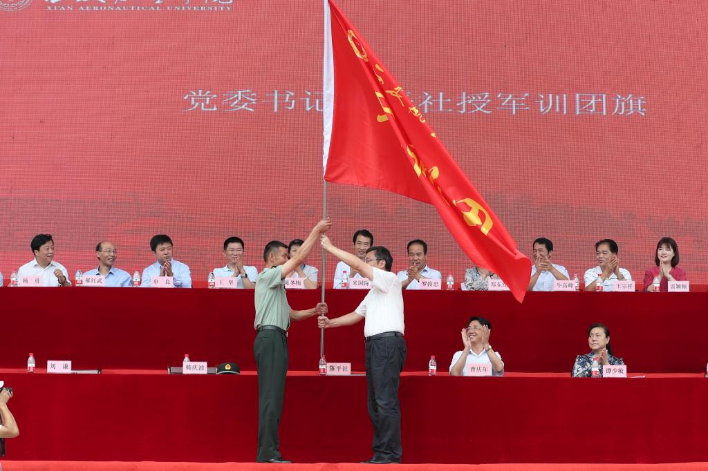 陈平社书记向beat3652018级新生军训团授团旗。全体校领导向军训团各营授营旗。