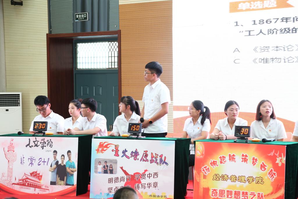 全体与会师生庄严宣誓,重温入党誓词。经过初赛和复赛选拔,7支代表队脱颖而出进入决赛,决赛现场各参赛选手精神饱满、奋勇争先、大展风采。必答题环节沉着稳定,抢答题环节灵敏机智,冒险闯关环节勇往直前,选手们以丰富的知识储备和精彩的表现赢得现场观众阵阵掌声。比赛间隙还设有易班平台观众互动环节,现场观众热情高涨、踊跃参与,气氛十分活跃。经过激烈的角逐,最终电子工程学院代表队获得一等奖,士官学院代表队、人文学院代表队获得二等奖,外国语学院代表队、机械工程学院代表队、计算机学院代表队、经济管理学院代表队获得三等奖。