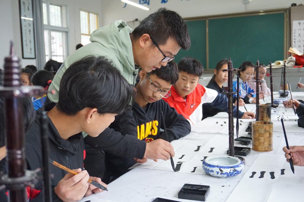 书画社成员向同学们详细介绍了书画的基本知识及书画渊远的文化历史。他们与同学们一起动手书写,手把手地教同学们如何书写毛笔字,鼓励同学们积极传承和弘扬中华民族传统文化。