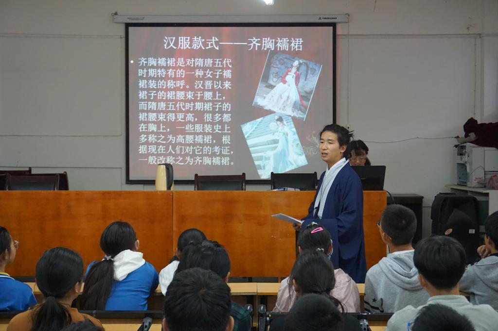 学校汉服社成员身着汉服为同学们介绍汉服的文化内涵和传统礼仪,并邀请同学们换上汉服,一同向大家展示汉服的文化魅力。