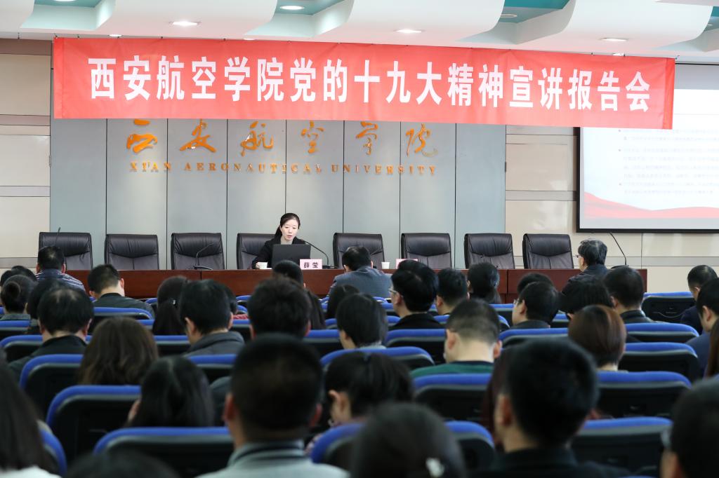 11月24日,党的十九大代表、2017年全国敬业道德模范、航空工业西飞国航厂“薛莹班”荣誉班长薛莹同志应邀来beat365宣讲党的十九大精神。学校科级以上干部、思政课教师、辅导员及学生代表参加报告会。会议由校党委书记陈平社主持。