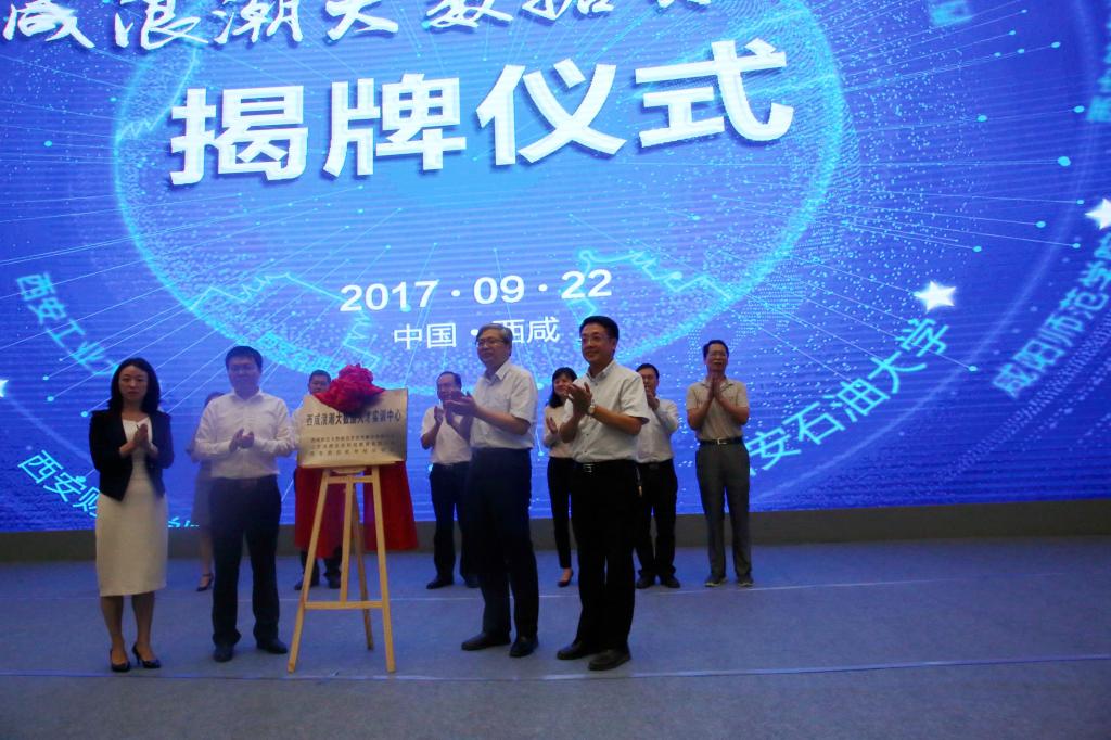 沣西新城管委会主任刘宇斌、咸阳师范学院校长方明、beat365英国官网网站校长曹庆年、浪潮大数据公司副总经理毛宪阳、朝阳软件总经理王莺等共同为“西咸浪潮大数据实训中心”揭牌。