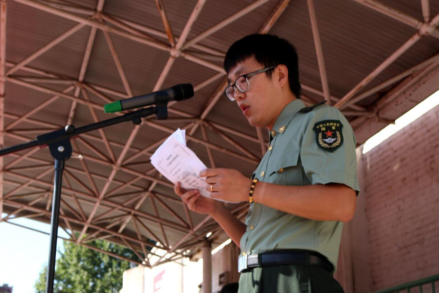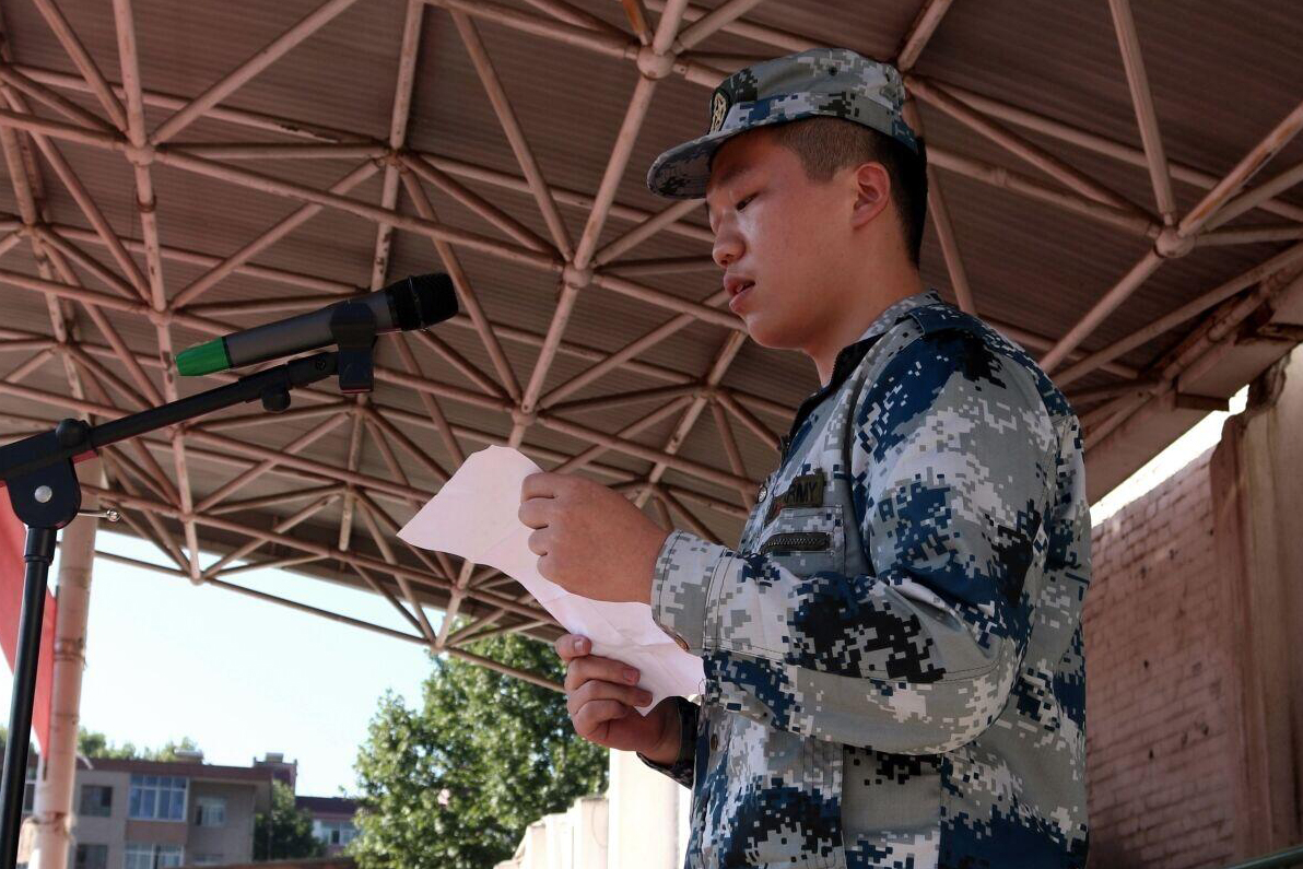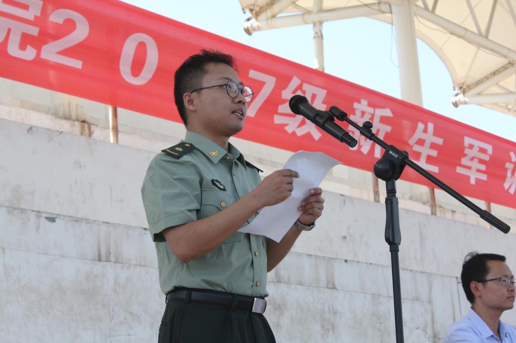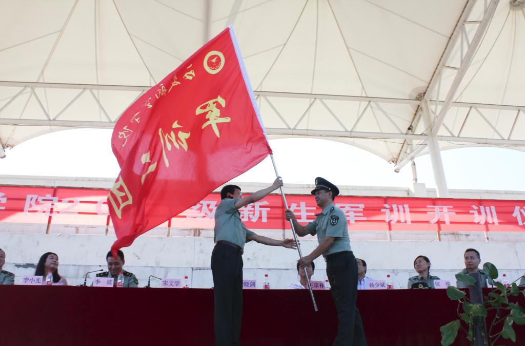 教官代表肖楠、陈航,指导员代表刘雨辰、周俊屹及2017级新生代表分别作了表态发言。会上,谭少敏、宋文学分别向军训团授旗。