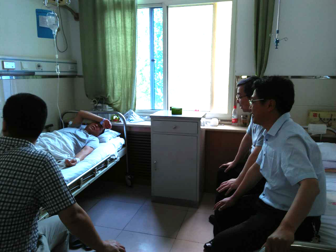 6月2日上午,学校党委书记陈平社、校长曹庆年在党政办公室主任蔡应昌的陪同下,前往西电医院看望通勤班车驾驶员柳改民,详细询问身体康复情况,代表学校肯定赞扬柳师傅在生命危机关头,强忍病痛,坚持将教职工安全送达学校的忘我精神和职业品德,并祝愿其早日康复。