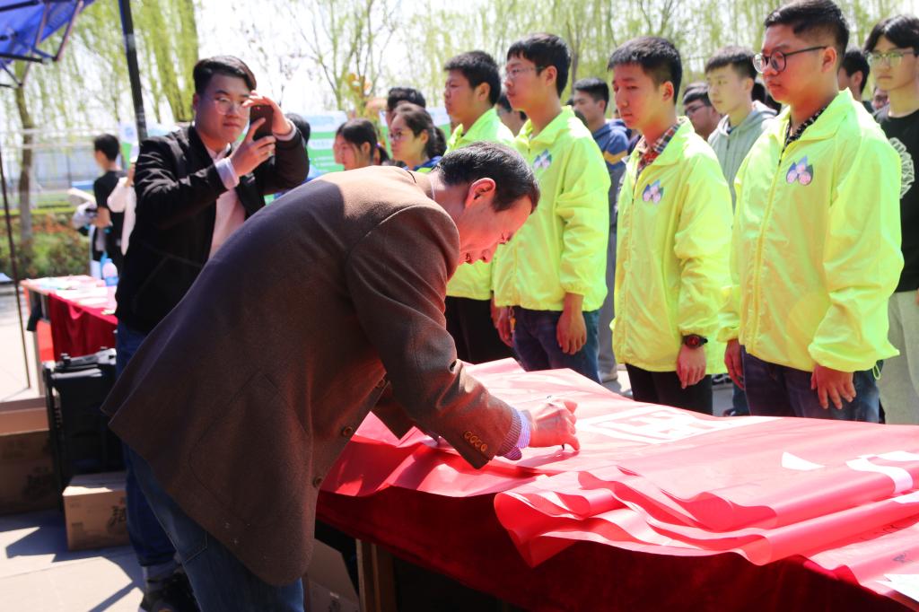 活动中,校学生会组织志愿者共同学习国务院颁布的“环保水十条”,进行了节水宣誓并通过主题横幅签名的方式唤醒广大青年学生的节水意识。活动现场发放千余张节水知识小卡片,学生志愿者们参与互动,增强节水知识普及效果。西航学子引用以“水”为主题的古诗句表达节水、惜水的理念。书画协会现场挥毫泼墨书写“饮水思源”,倡导广大同学节约用水。杨俊、杨松峰也同学生志愿者一起宣誓签名,传递节水理念。