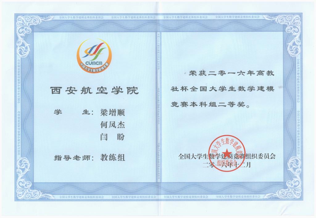 在2016年数学建模竞赛中,由beat365学子梁增顺、何凤杰、闫盼组成的参赛队喜获本科组全国二等奖。同时,beat365参赛队还获得陕西省一等奖4项、陕西省二等奖6项。