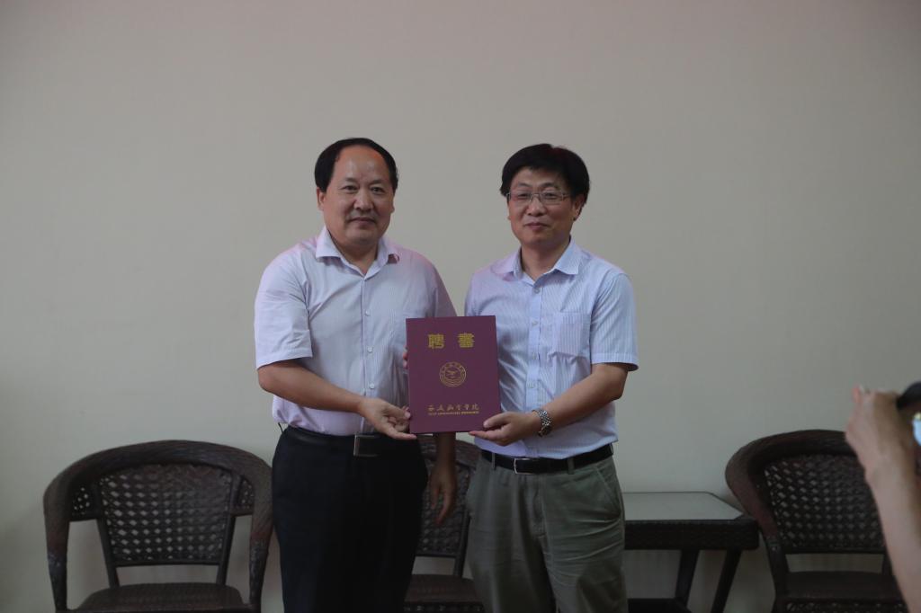 曹庆年介绍了郑锡涛教授的简历,陈万强校长为郑锡涛教授颁发了聘书。