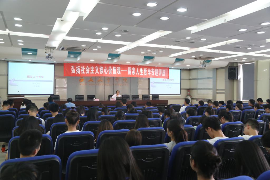 6月14日下午,由校团委、思政部共同组织举办的“弘扬社会主义核心价值观——儒家人生哲学”专题讲座在学校沣惠校区图书馆学术报告厅举行,西北大学马克思主义学院副院长王永智教授为青年学生做报告,报告会由思政部主任程健康主持。