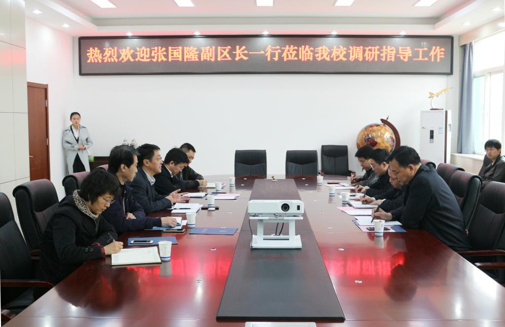 曹庆年欢迎张国隆副区长一行来校调研,感谢阎良区委、区政府长期以来给予学校各项工作的大力支持,他从学校历史沿革、办学定位、特色优势、学科专业和实验室建设、校企合作、招生与就业、“十三五”规划等方面,详细介绍了学校发展建设情况。他表示,学校一直高度重视与阎良当地企业合作,也将大力支持并积极参与阎良航空职业教育改革试验区建设。